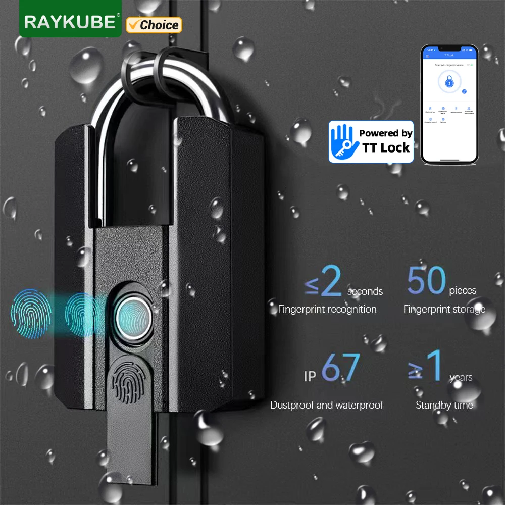 RAYKUBE IP67 Waterproof TT Lock Bluetooth Electronic Lock Digital Fingerprint Padlock with Built-in rechargeable Battery APP key Unlock
