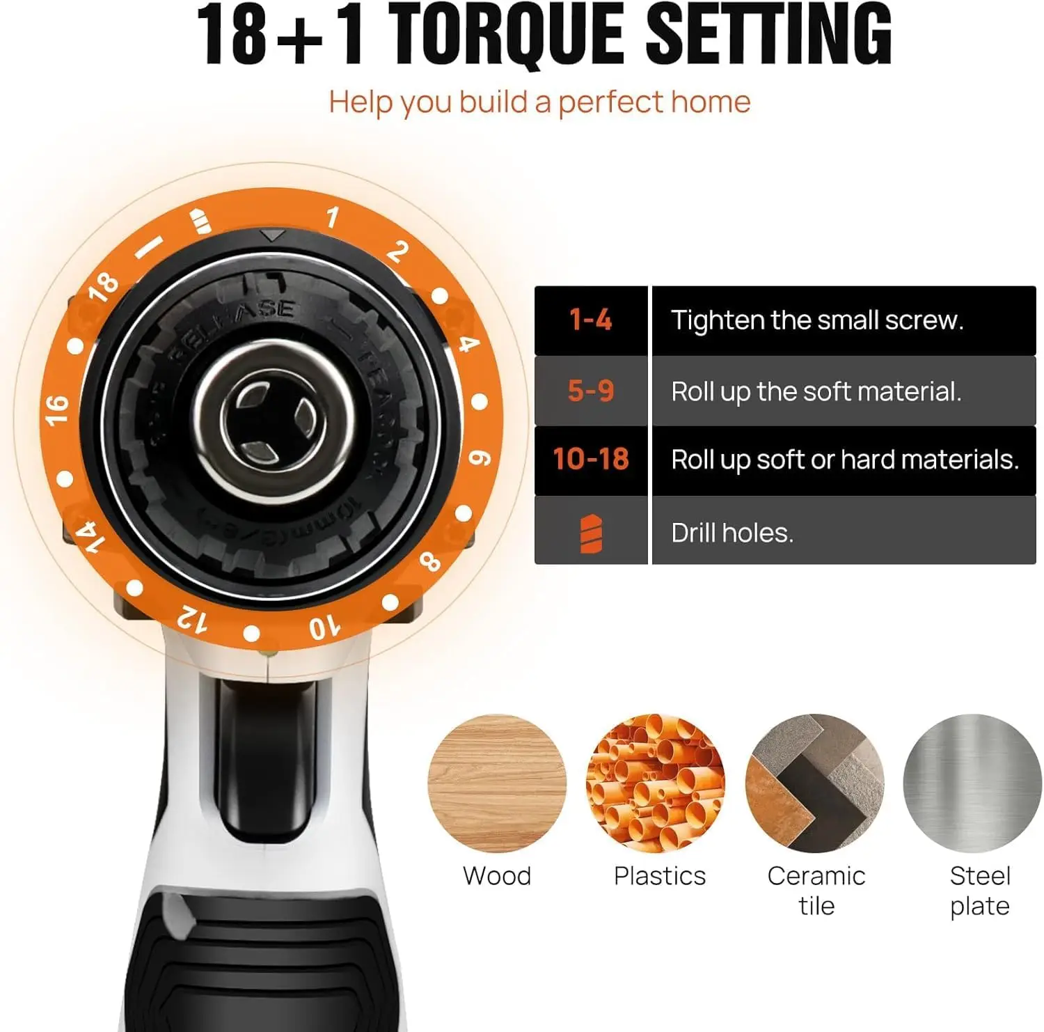 【18+1 Torque Settings】: The cordless screwdriver has a high torque of 45Nm, 18+1 torque settings are available to meet your needs, 1-4 for tightening small screws; 5-9 can roll up soft materials; 10-18 can roll up soft or hard materials; the last one can be drilled.