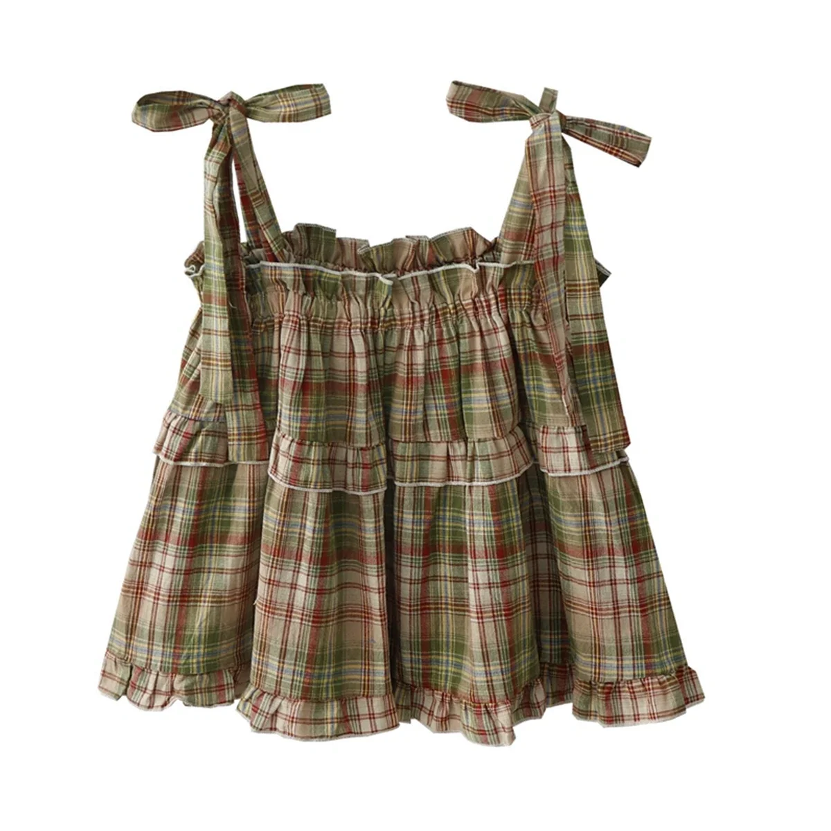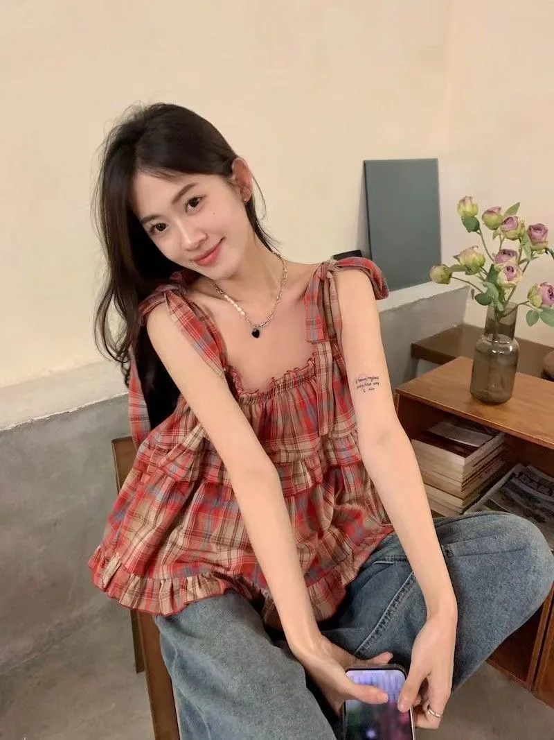 1 review for Red Plaid Camisoles Women Vintage Ruffles Cute Girlish Cropped Tops Holiday Cool Streetwear College Stylish Princess Sleeveless