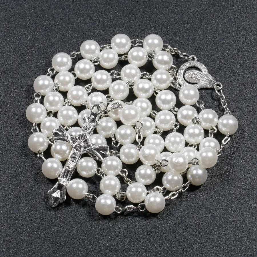 Religion Faux Pearl Rosary Necklace For Women Virgin Mary Jesus Cross Pendant Long Beads Chain Men Christian Fashion Jewelry