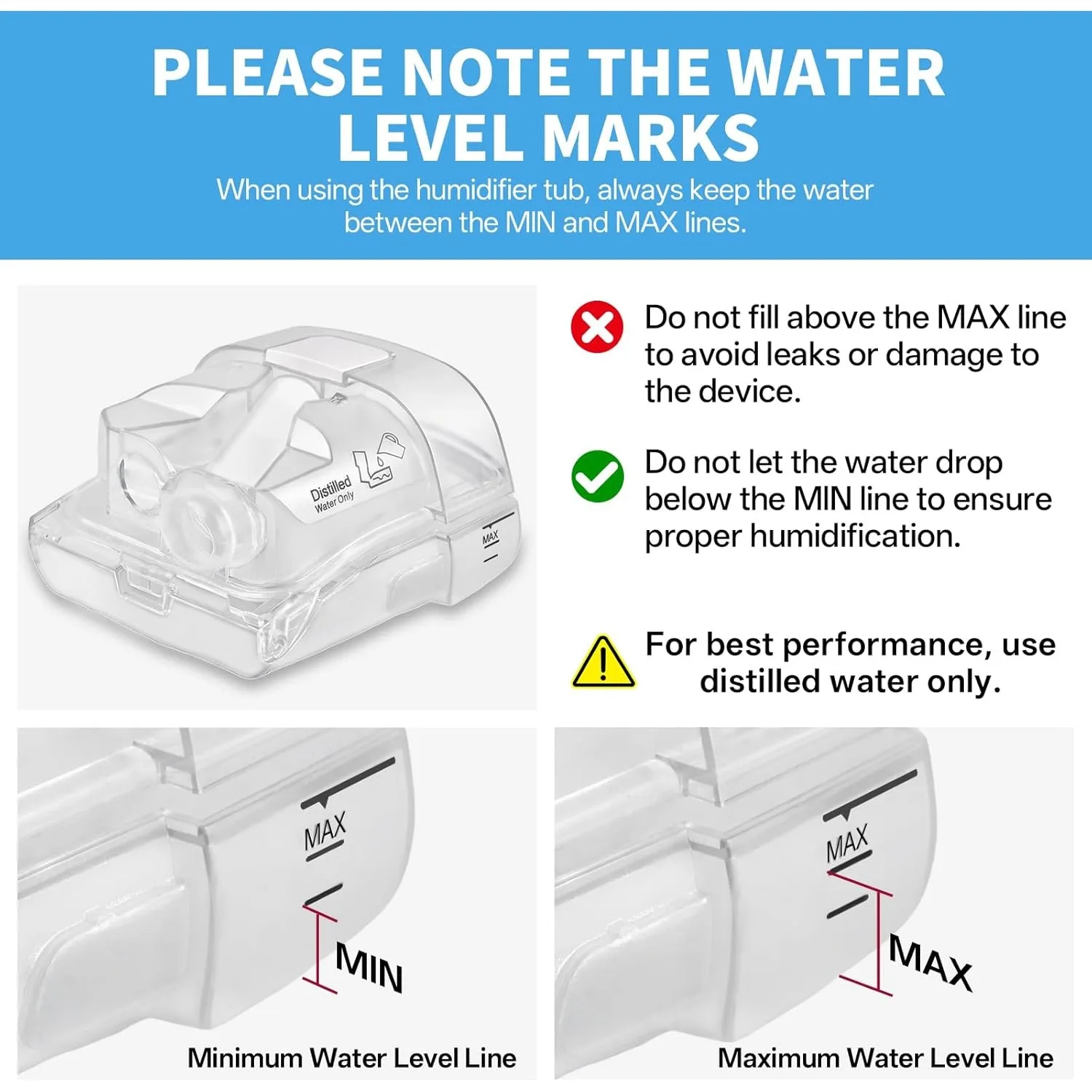 【Durable for Long-Term Use】 Made of 316 stainless steel and high-quality plastic, it is heat-resistant and anti-deformation. Standard 380ml water capacity allows for the regular use of your CPAP machine without any interruptions.