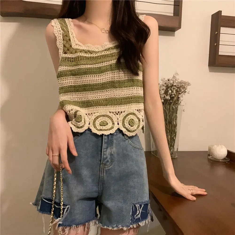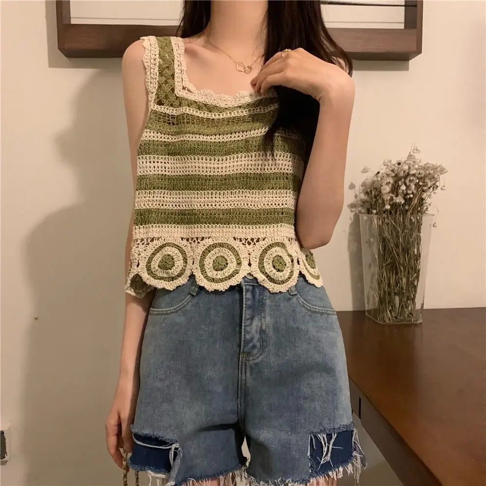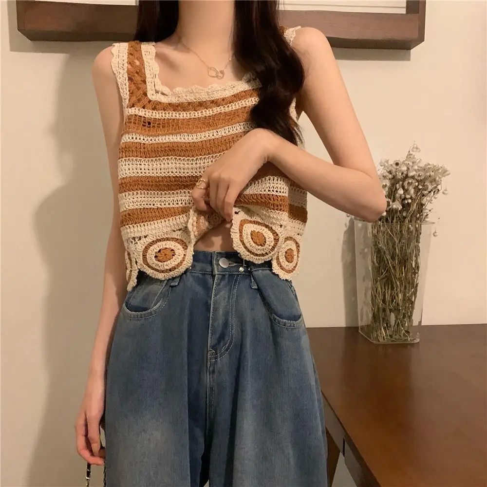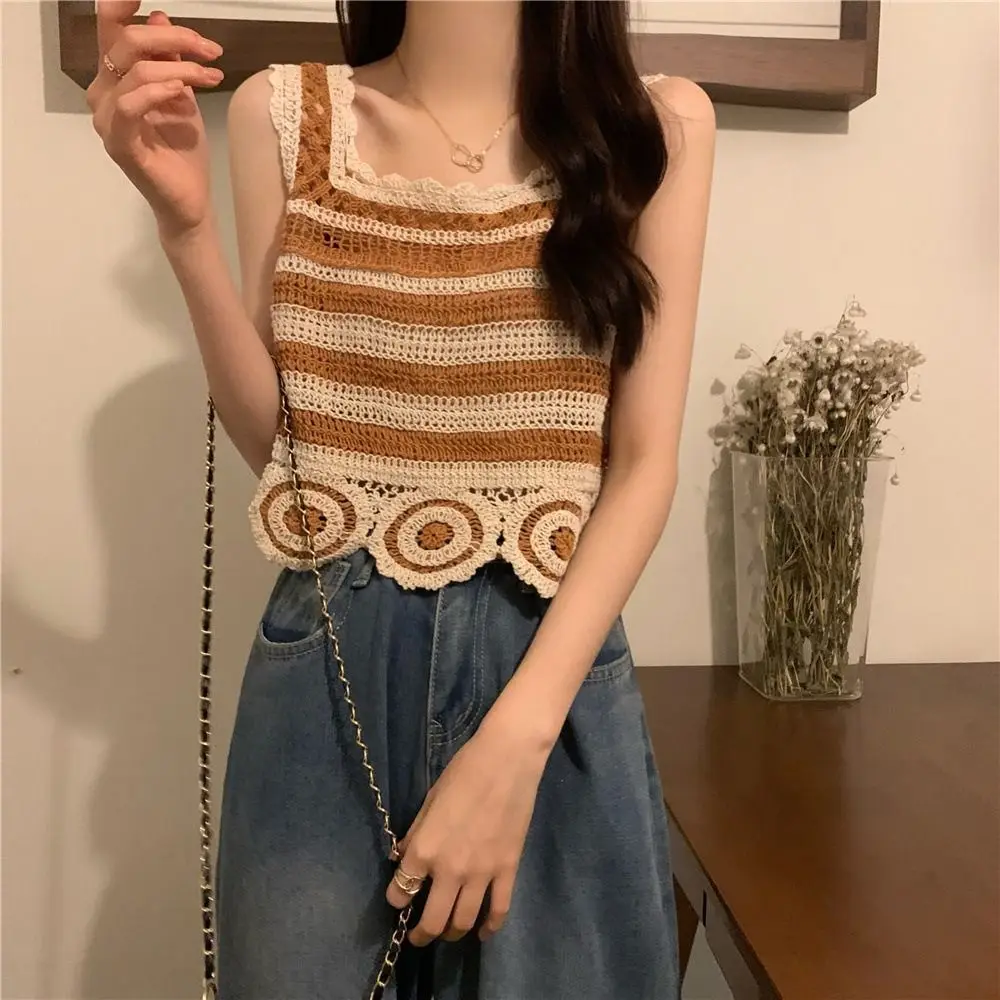 Retro Fashion Knitted Crop Top Sleeveless Vest Embroidery Pattern Tank Top Summer Elegant Short Top Camisoles