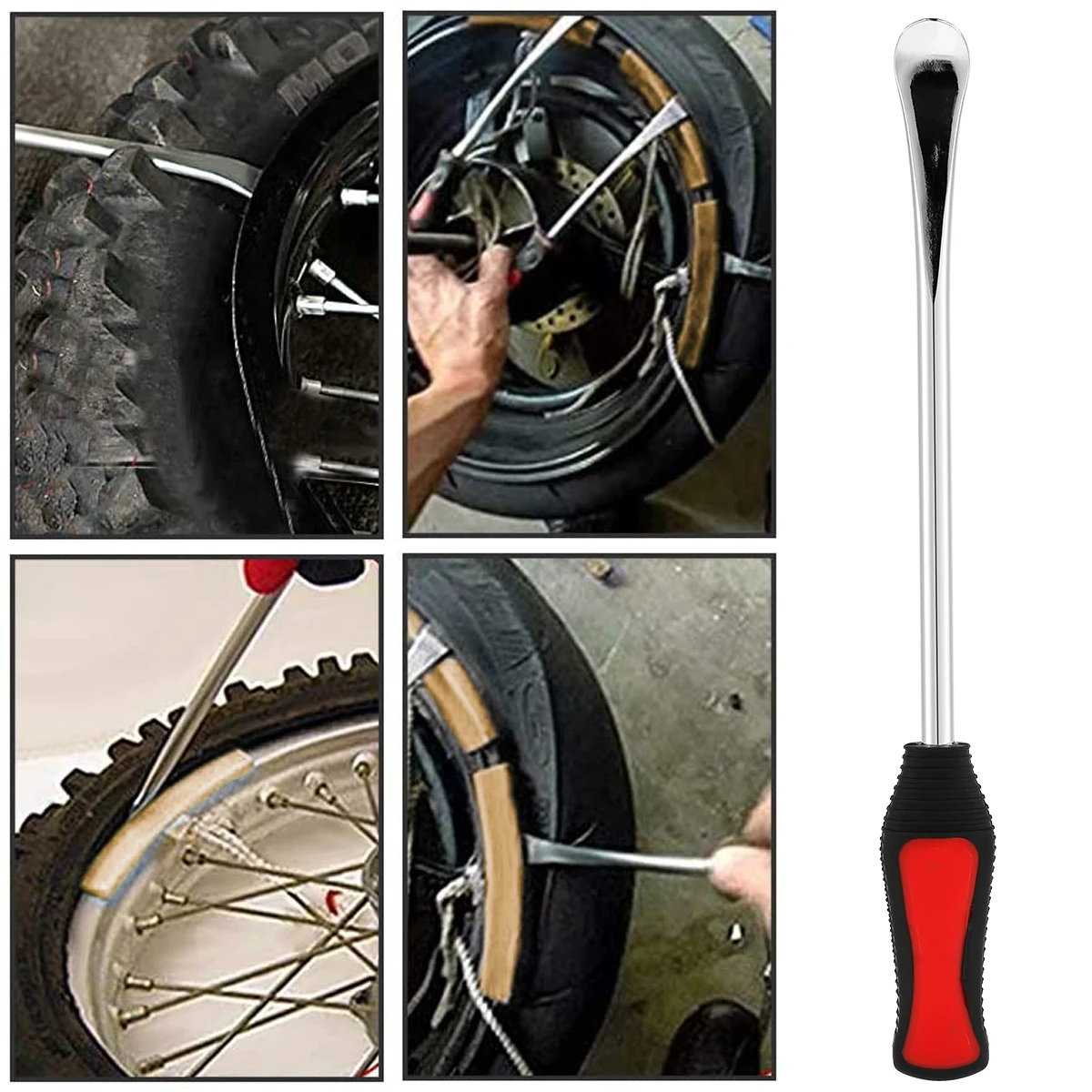 [Durable Materials] The motorcycle tire repair tool spoon kit is made of high-quality steel spoon levers and plastic structure tire rim protector, with a polished chrome finish for good rust and corrosion resistance.