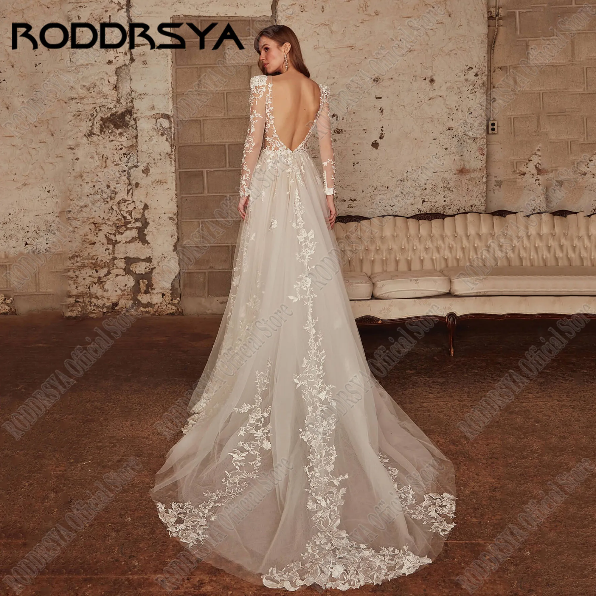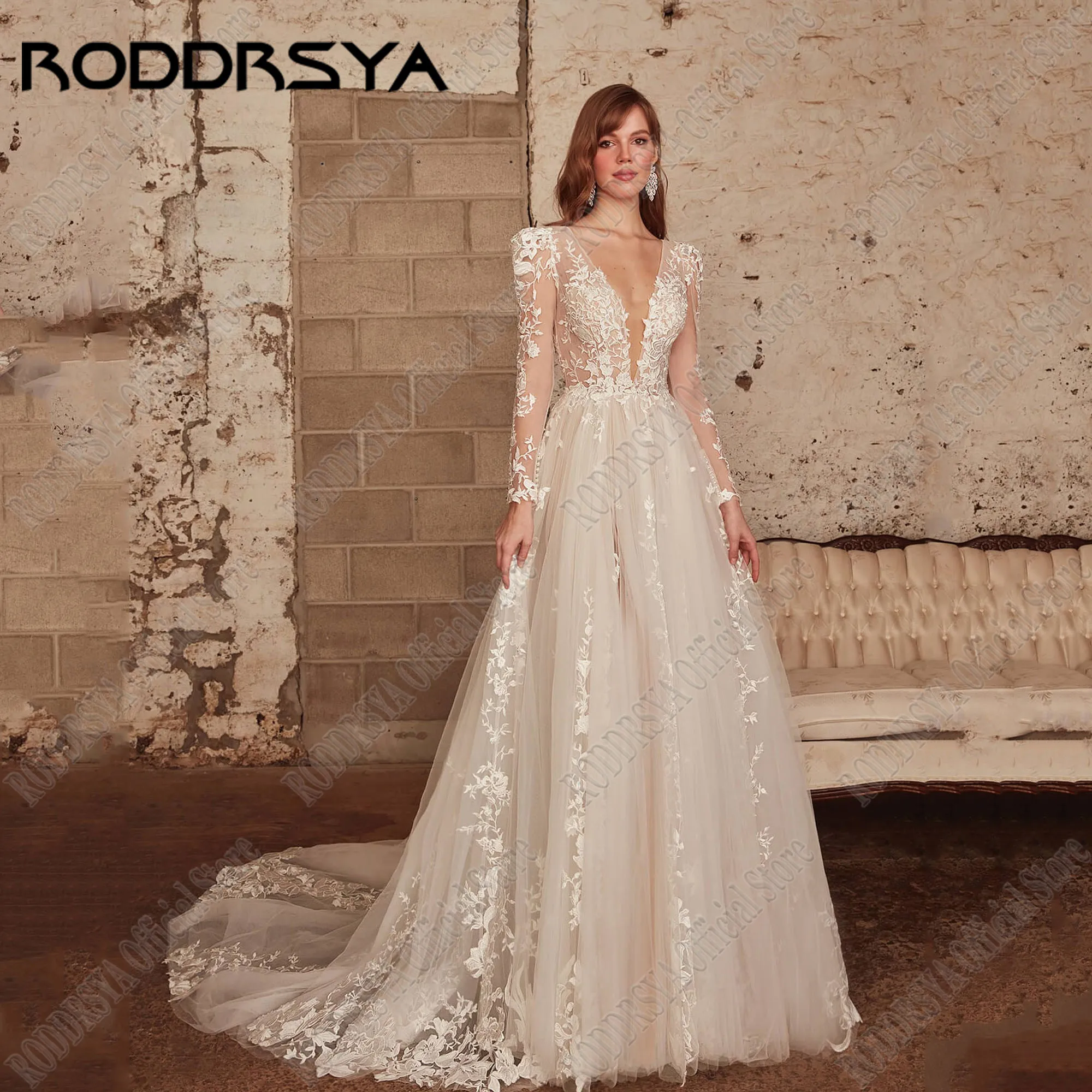 RODDRSYA Full Sleeve Wedding Dress 2025 V Neck Backless Applique Lace vestidos de novia Sweep Train Tulle Bride Gowns Customized
