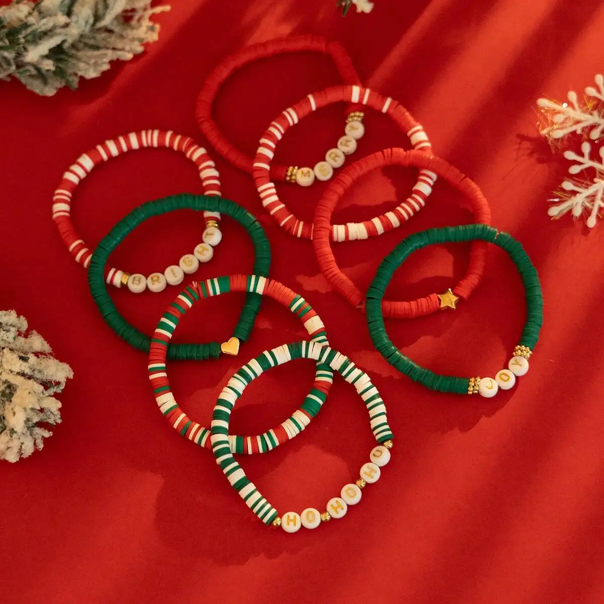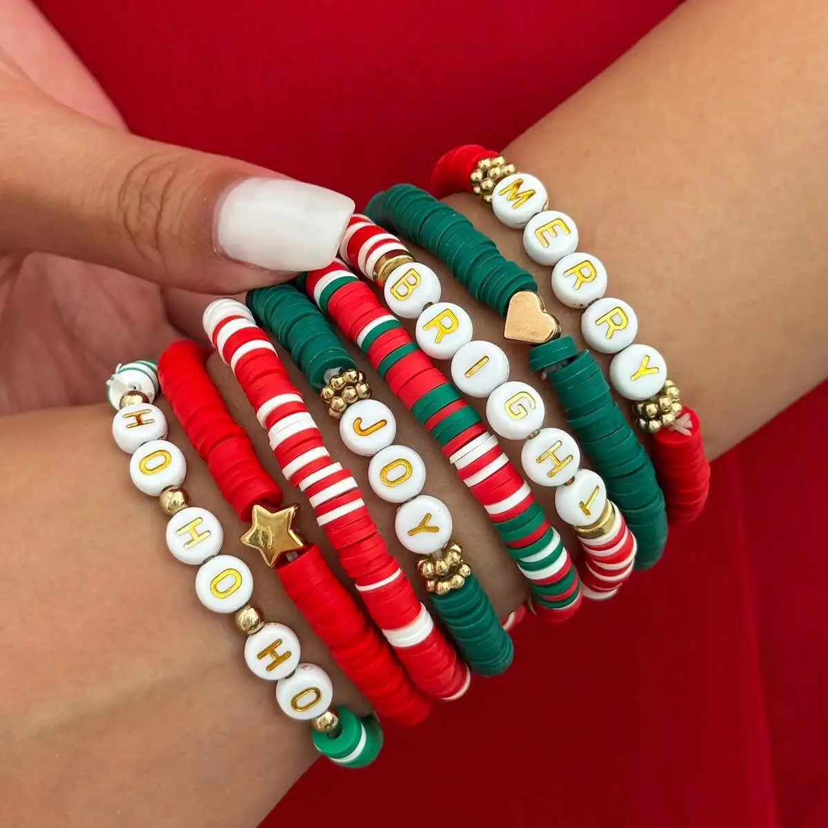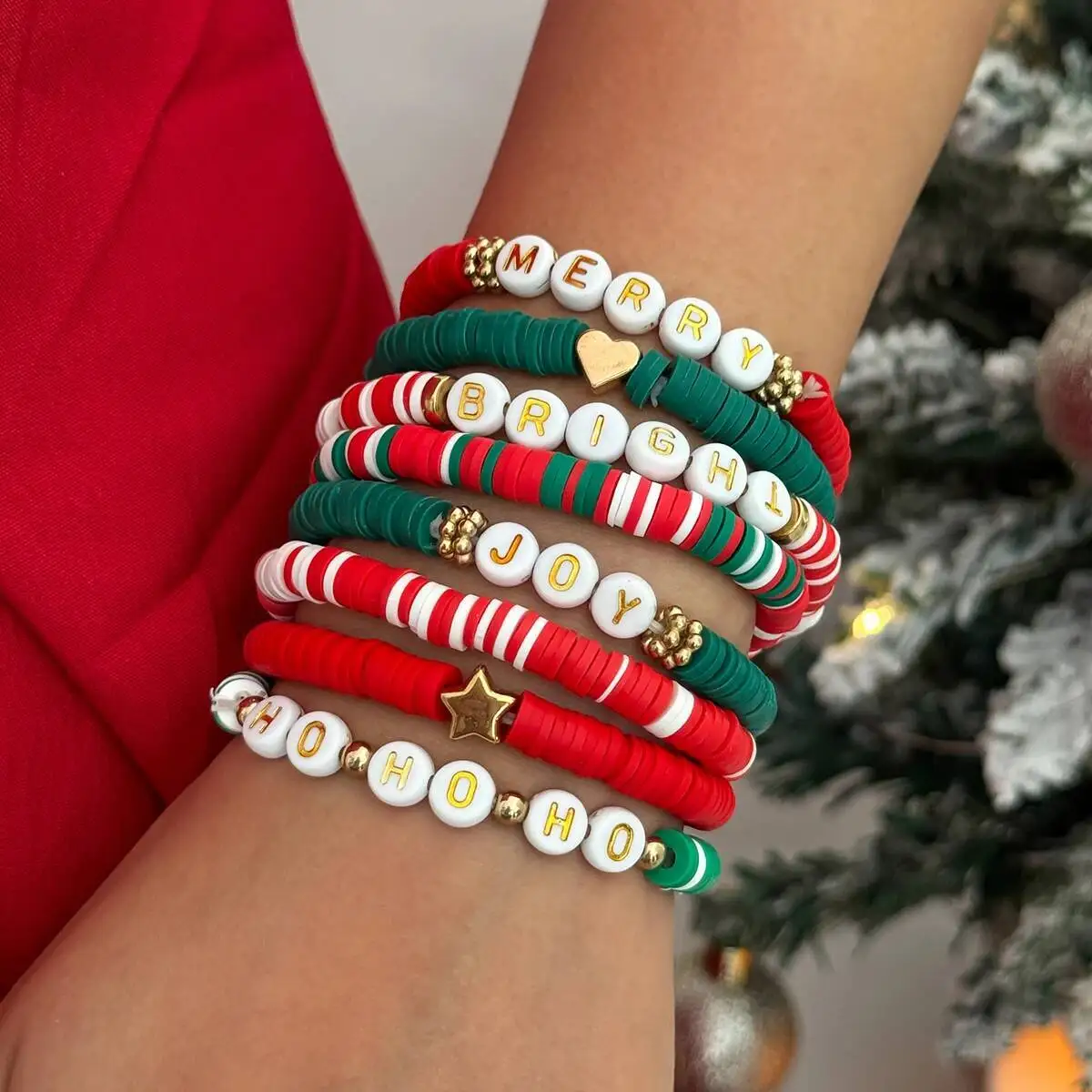 Salircon 8 Pcs Y2K Christmas Series Polymer Clay Bead Adjustable Bangles Women New Year Elastic Stackable Bracelets Jewelry Gift