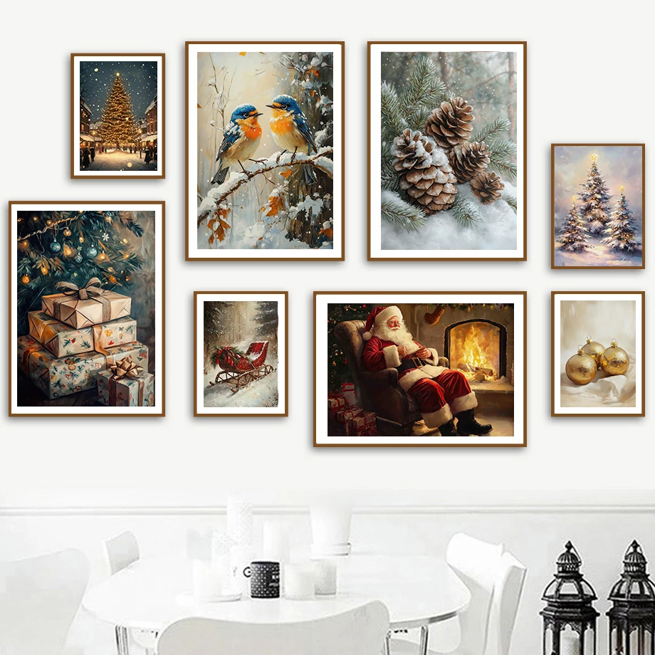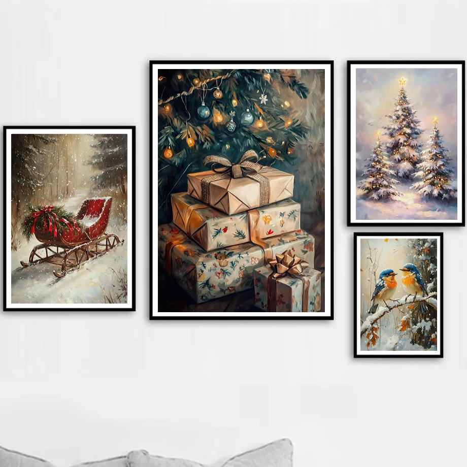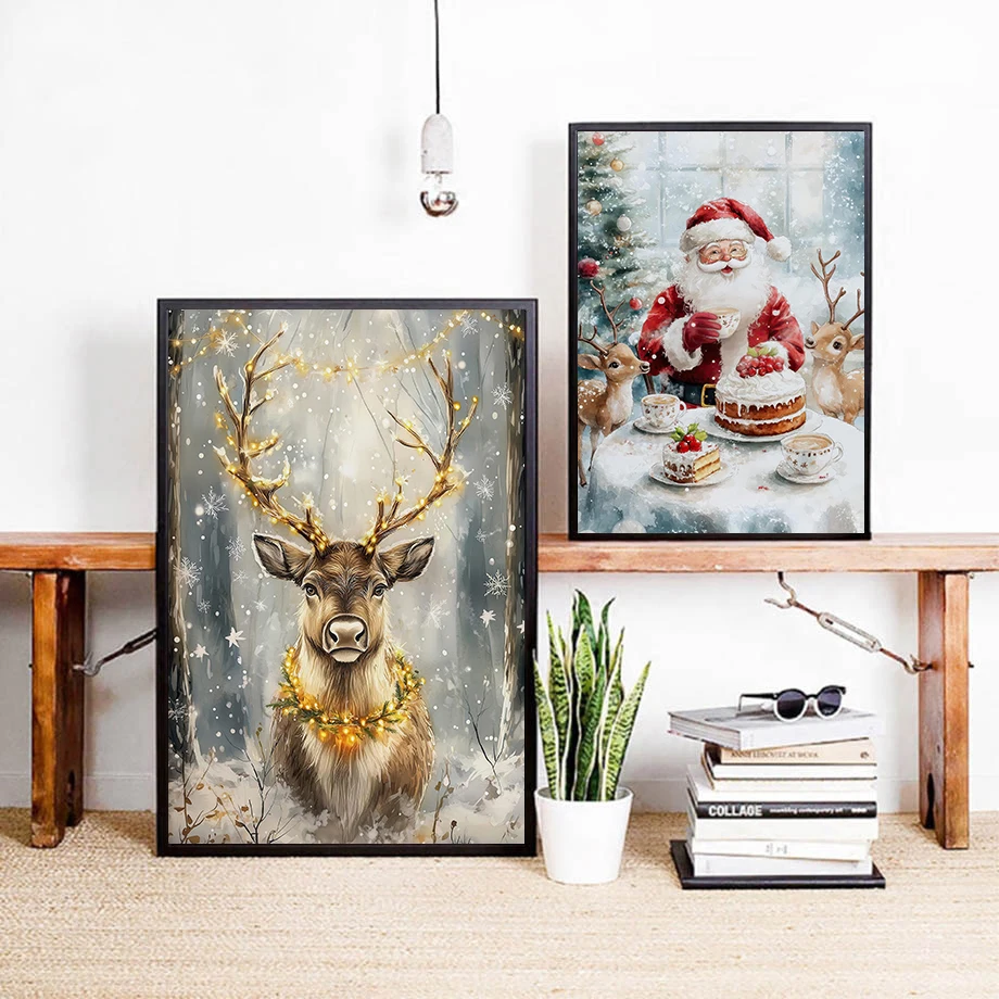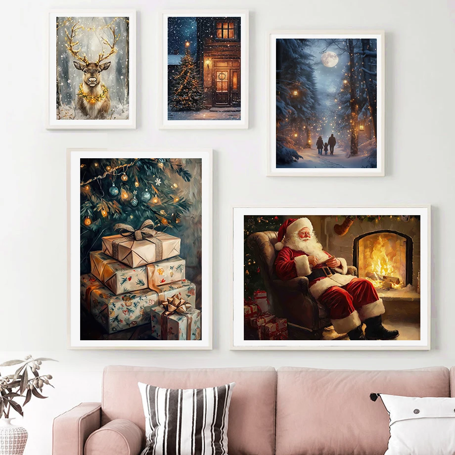 Santa Claus Sleigh Christmas Tree Elk Christmas On A Night Christmas Gift Fashion Wall Art Canvas Painting Nordic Poster Decor