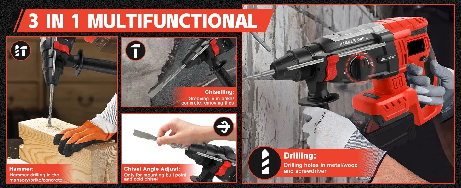 【3-Working Modes With Overload Protection】This rotomartillo for Milwaukee offers 3 operational modes: drilling, hammer drilling, chiseling, and chisel angle adjustment. The integrated overload clutch protector and automatic thermal shut-off prevent damage during heavy use, while the mode selector allows quick adaptation to different materials and tasks.