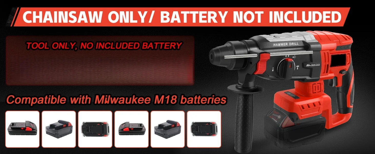 【Compatible With Mi.lwaukee M18 Battery】This SDS hammer drill is compatible with Mi.lwaukee M18 batteries including 48-11-1811、48-11-1815、48-11-1820、48-11-1822、48-11-1828 etc. (battery not included). The cordless design provides complete jobsite mobility while leveraging your existing Milwaukee battery system for convenient power source sharing across tools.