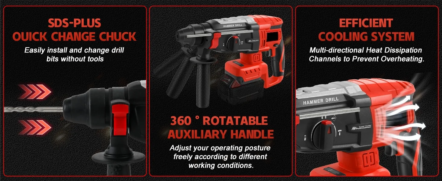 【360° Rotating Handle&Compact Design】The 360° rotating handle on this hammer drill maximizes comfort and control in various working positions. Weighing only 2.8kg (5.3 lbs) with a compact form factor, it easily accesses overhead and confined spaces while reducing user fatigue during extended operation.