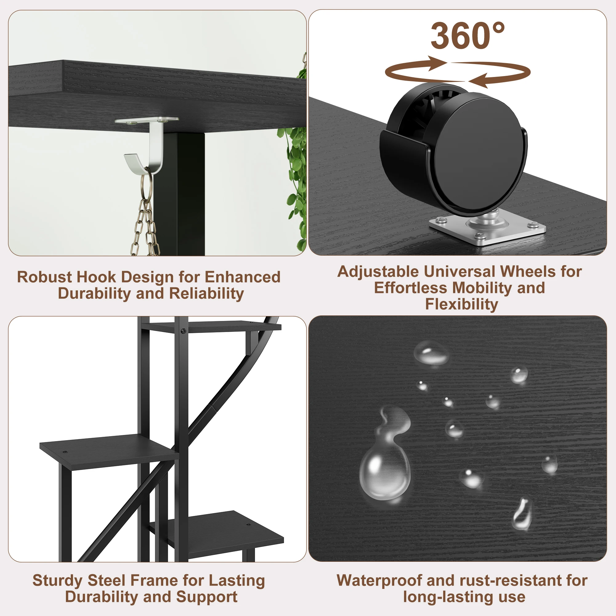 4. Durable and sturdy construction: Made with high-quality wooden shelves and a sturdy metal frame, our plant display rack is moisture and rust resistant, ensuring easy maintenance and cleaning. The curved design and reinforced base ensure greater stability and safety.