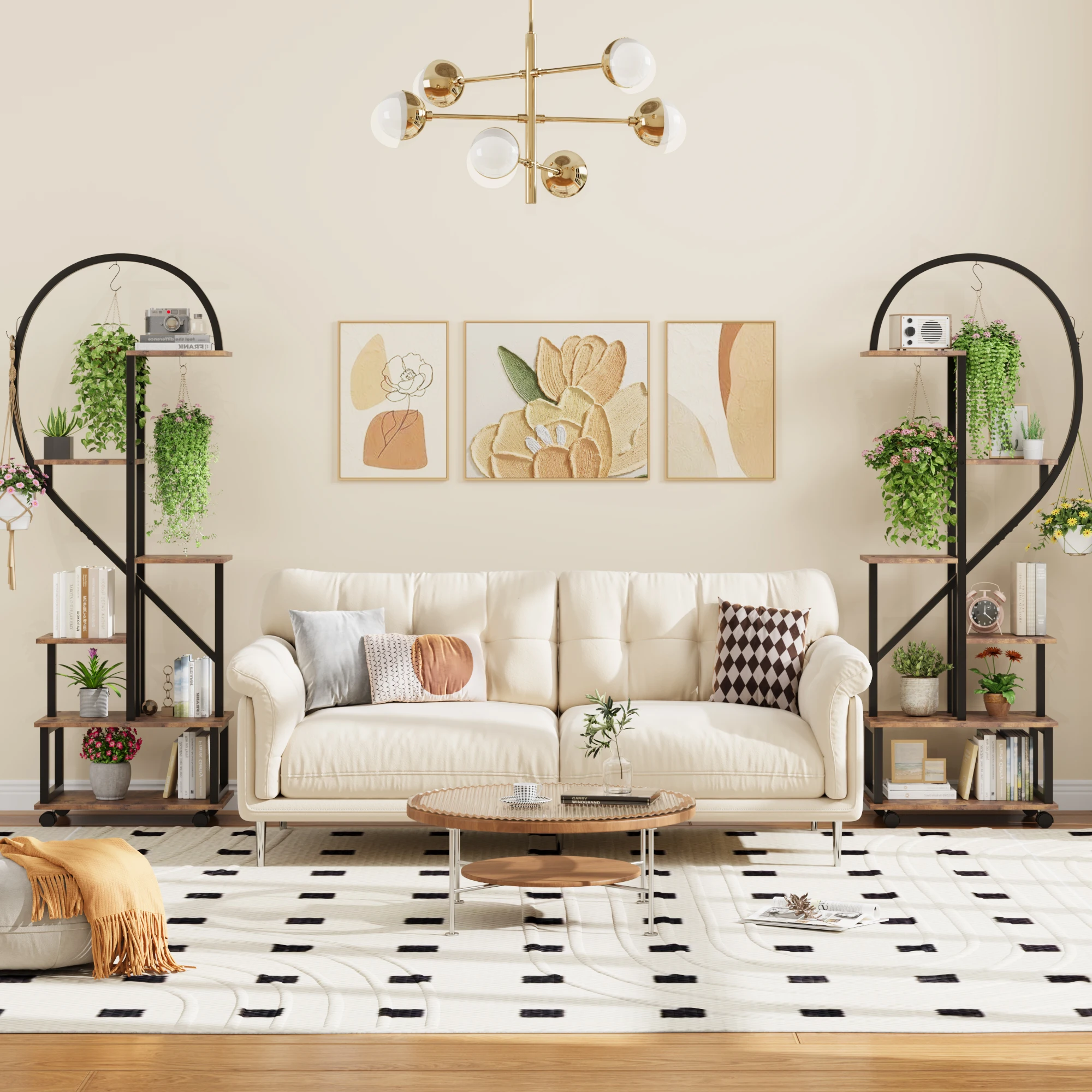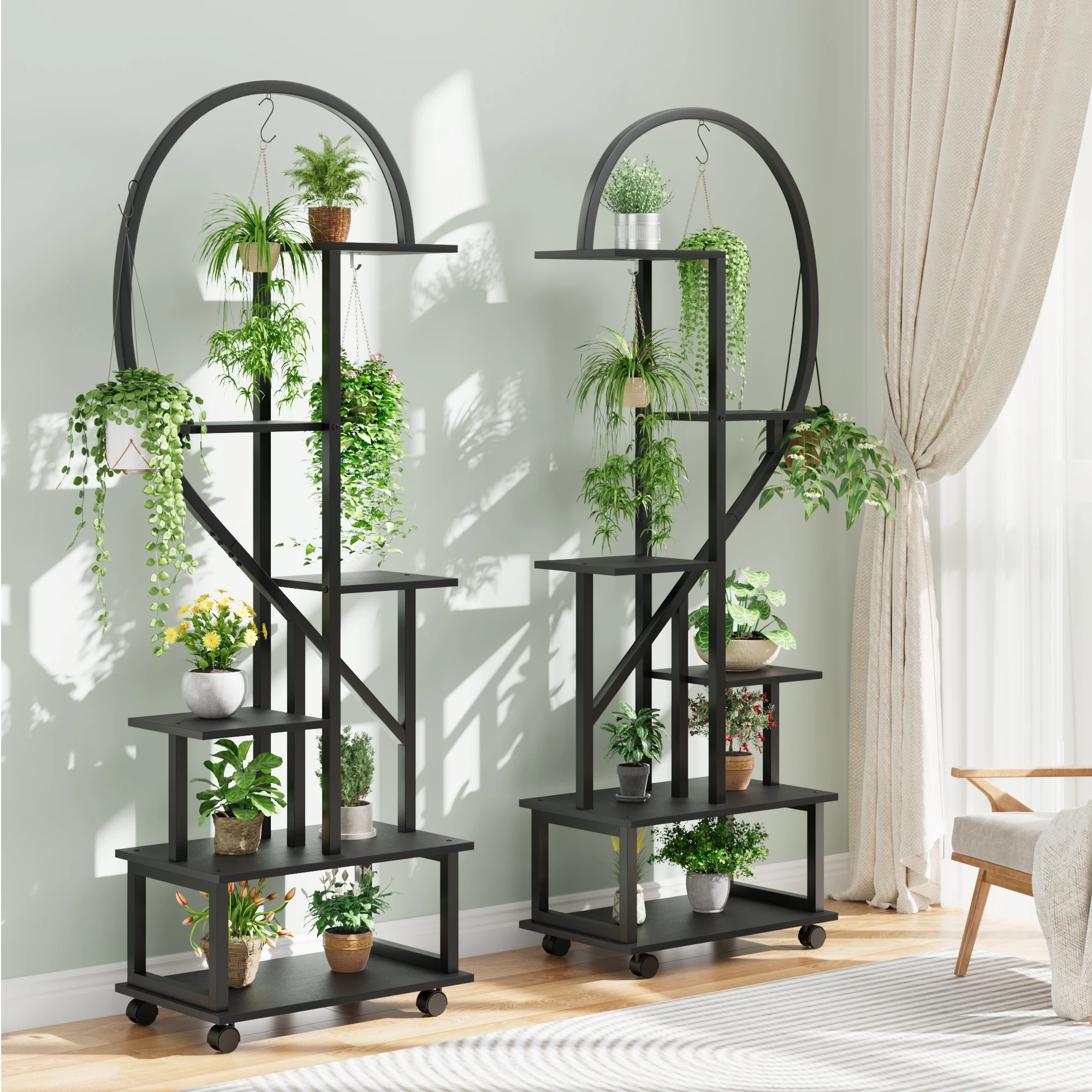 3. Multifunctional: With 6 shelves, 12 pot holders, and 6 hanging hooks, this indoor plant stand offers generous space to display your plants. It can also be used as an elegant display surface for books, collectibles, awards, artwork, and more, adding an artistic and elegant touch to your home.
