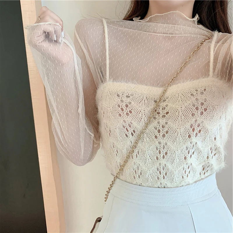 Sexy Women Mesh T-Shirts Transparent Lace Blouse Long Sleeve See Through Tops For Women O Neck Sheer Tees Chiffon Crop Top