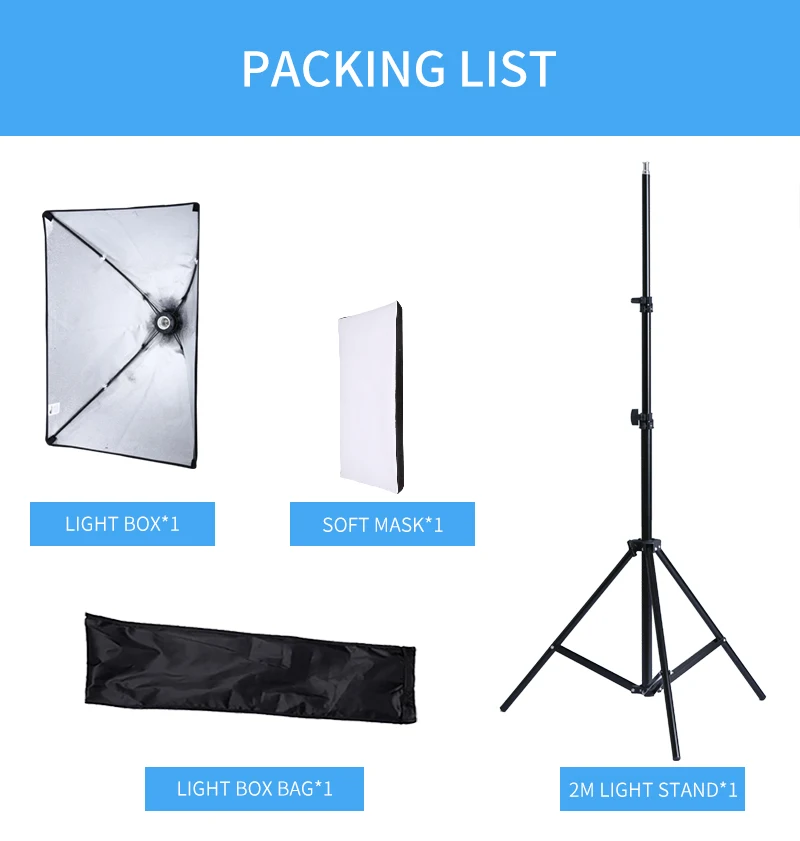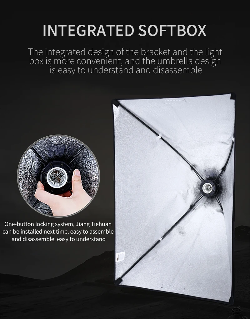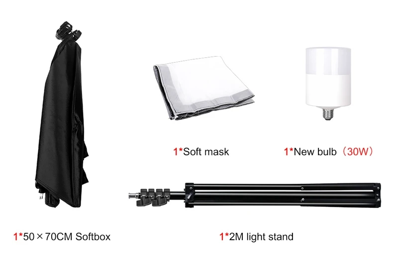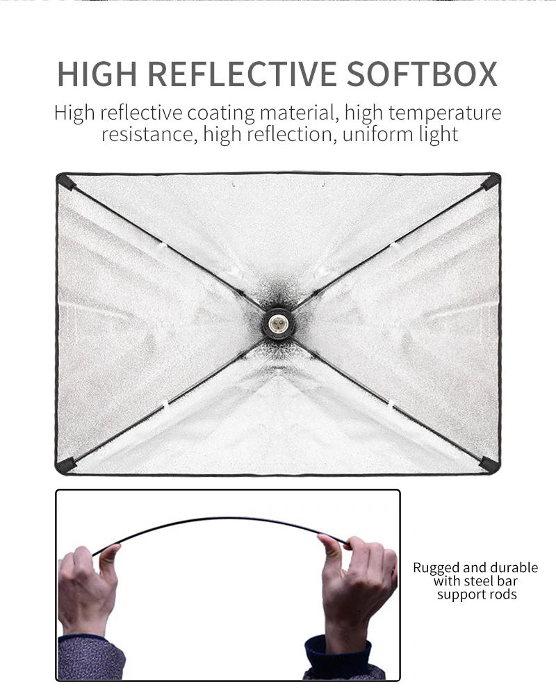 50x70CM single lamp head softbox:White foldable soft cloth,High quality reflective particle.Silver internal face to minimize light loss and maximize light spread. Safe and non-toxic polyester fiber,4 flexible connecting rods.