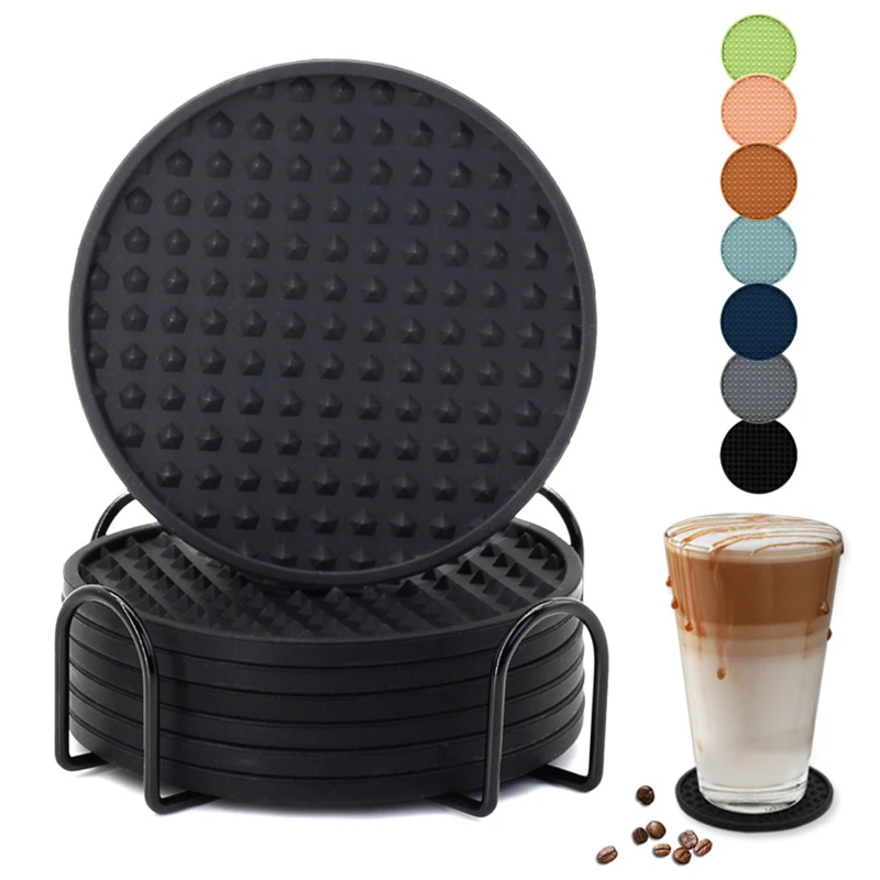 Silicone Coasters Set with W holder-Coffee Table Decor and Bar are BPA free. Silicone is resistant to odors, flavors and stains, and Deep Grooved Non-Slip Cup Coaster for Tabletop Protection Fit All Cups.