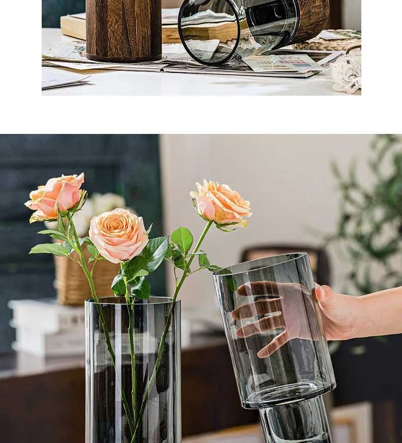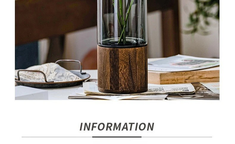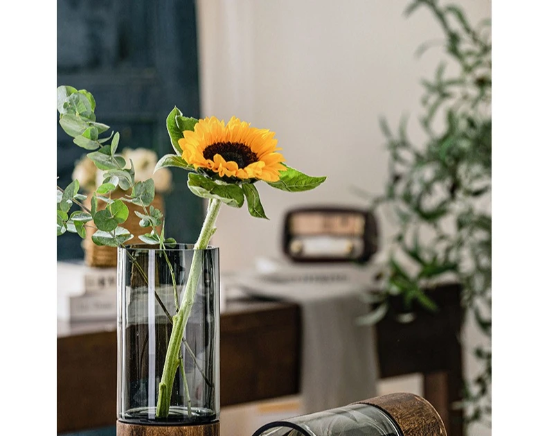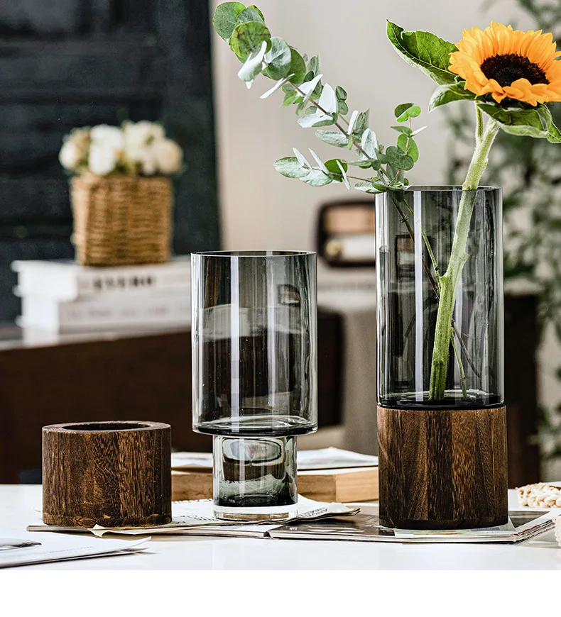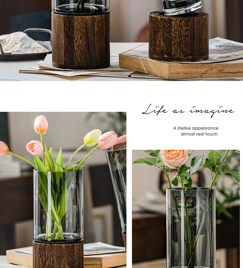 Simple Retro Light Luxury Wooden Base Glass Vase Water Nourishing Flowers Transparent Glass Vase Dining Table Decoration