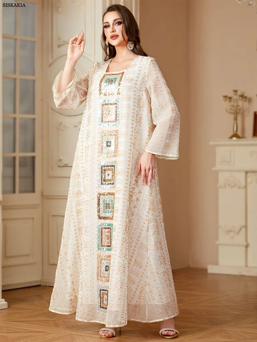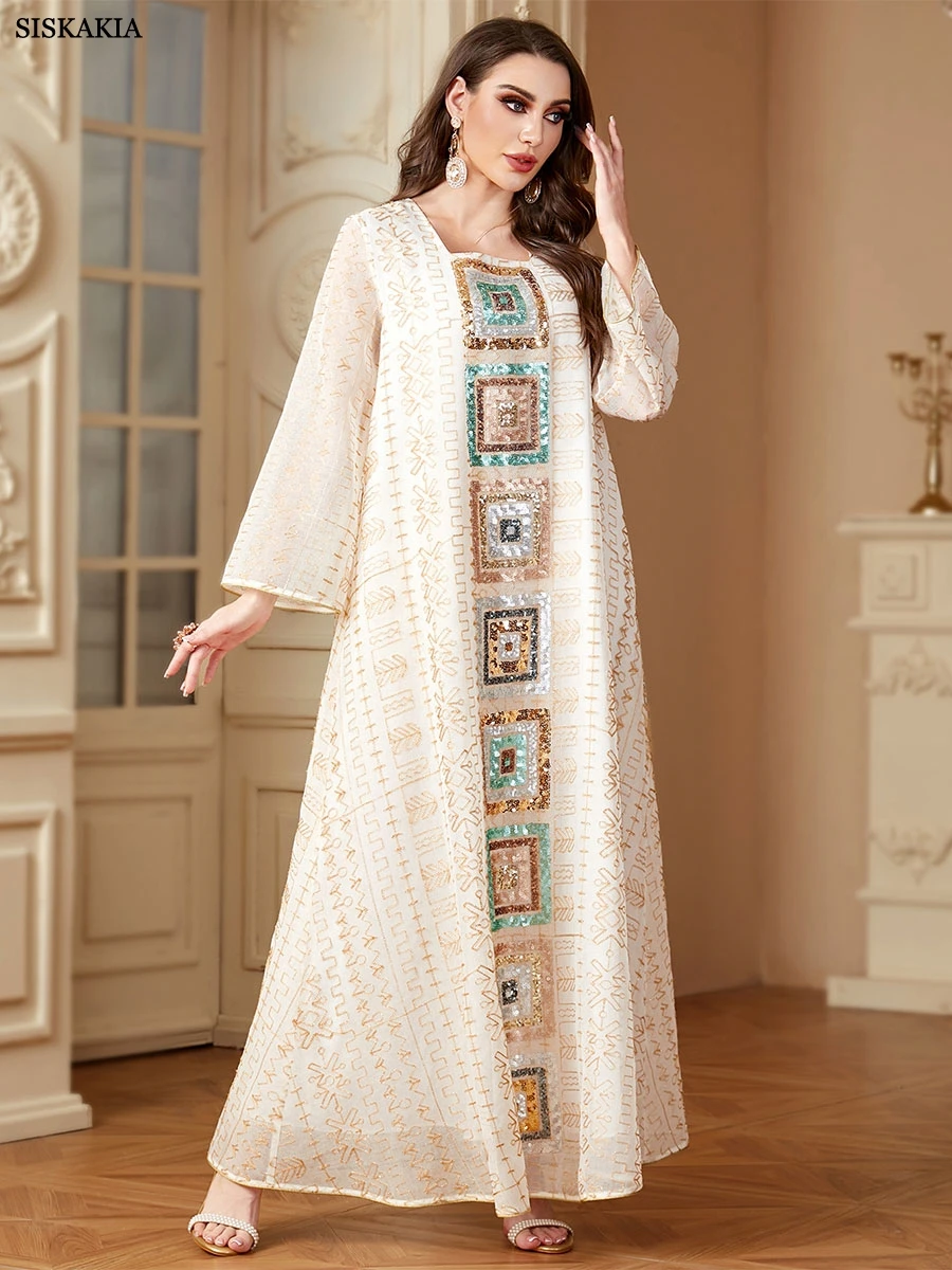 Siskakia Muslim Sequins Patchwork Dresses Women’s Jalabiya Ramadan Moroccan Dubai Mesh Fashion Kebaya Casual Loose Abayas 2024