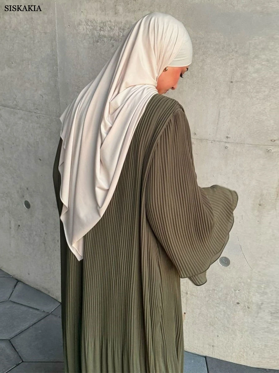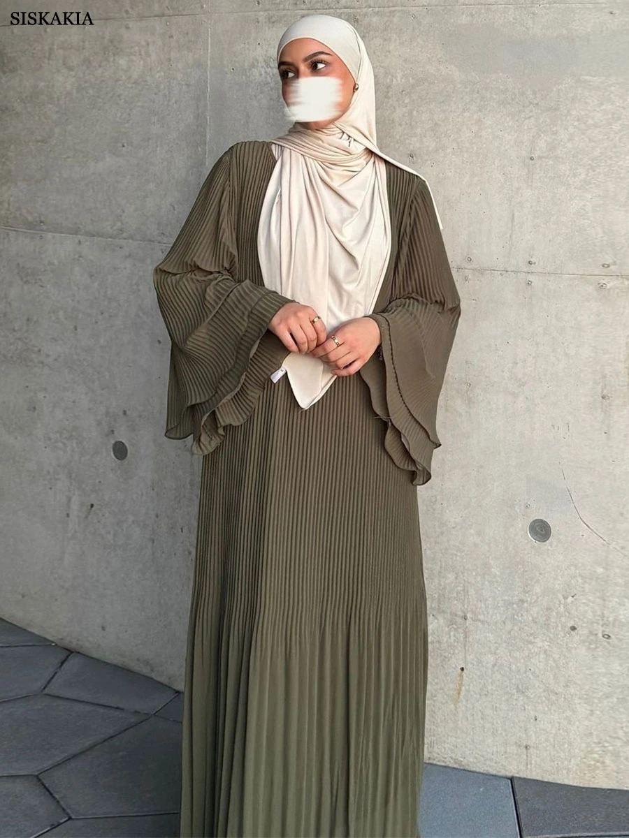 Siskakia Ramadan-Muslim Solid Wrinkle Dresses For Women’s Dubai Moroccan Petal Sleeve Abayas O-Neck Elegant Kebaya 2024