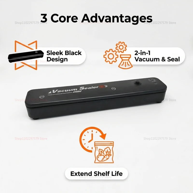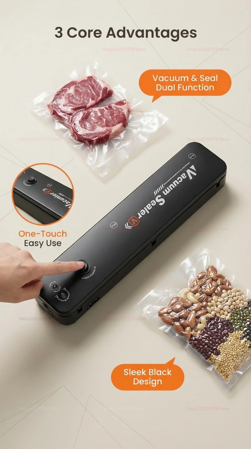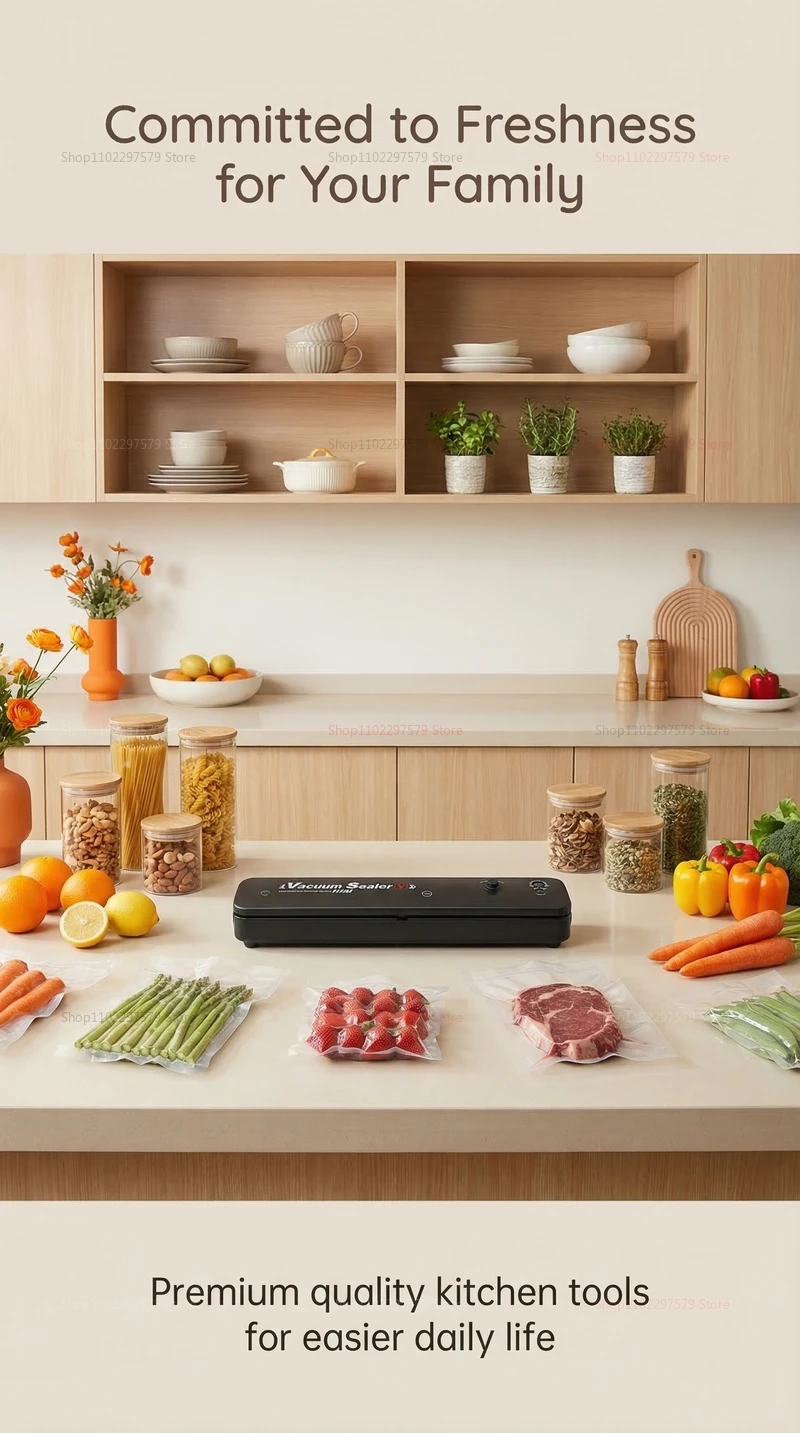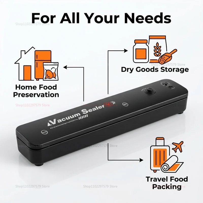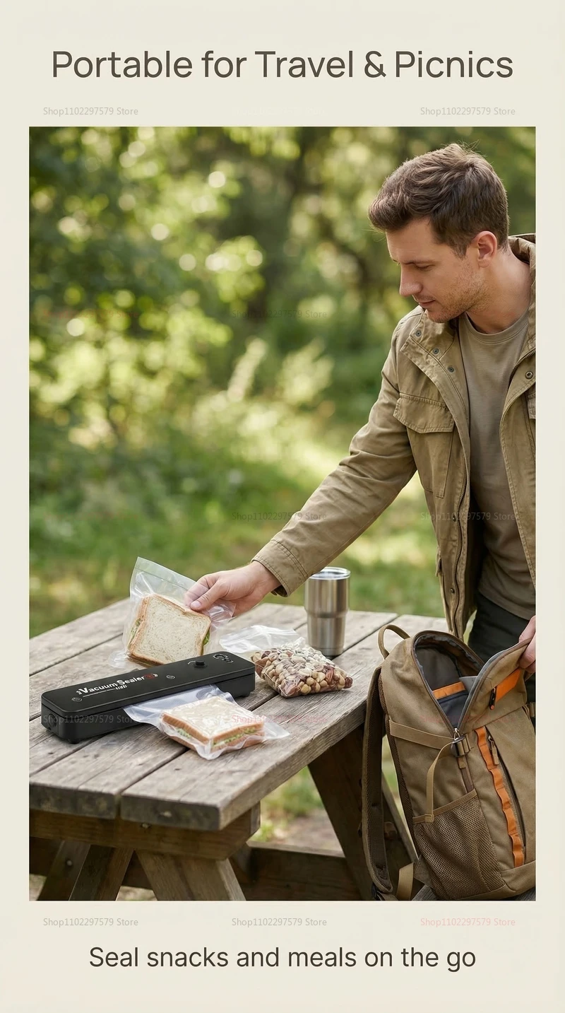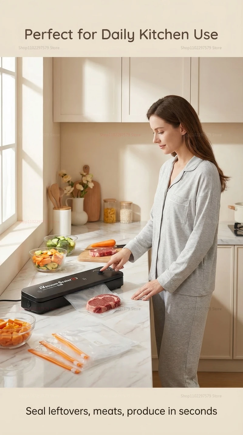 **Note:** For optimal sealing results, use high-quality vacuum bags compatible with this machine. This reliable vacuum sealer provides a convenient solution for preserving organic ingredients, leftovers, snacks, and prepared dishes — ensuring freshness for weeks longer. Whether for home meal prep, bulk storage, or outdoor adventures, this vacuum sealer is your ideal kitchen companion.