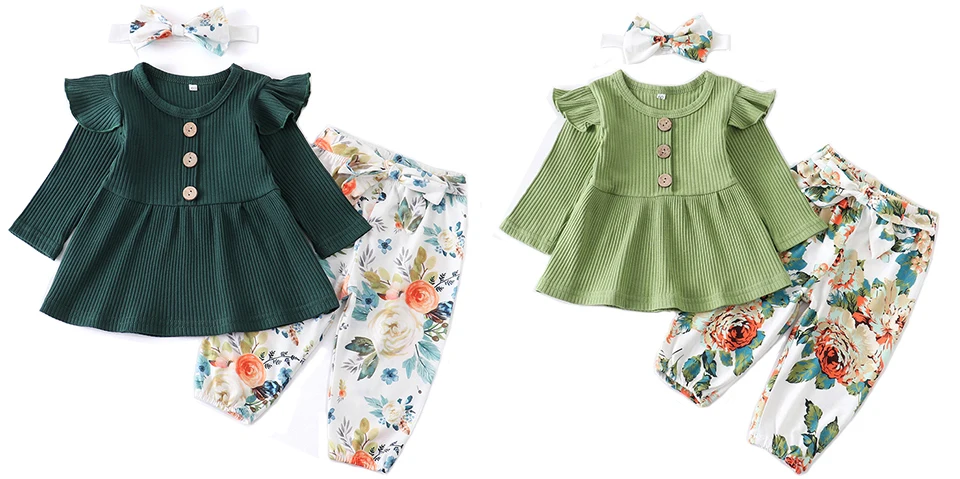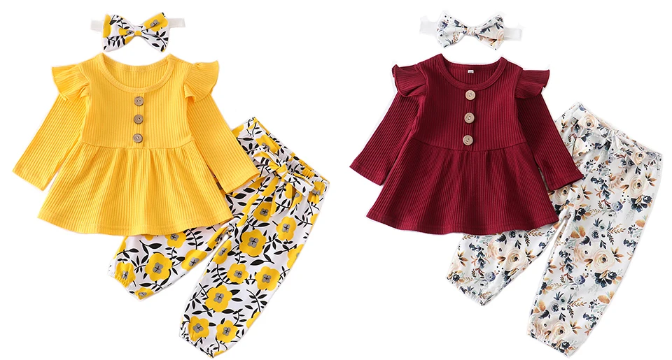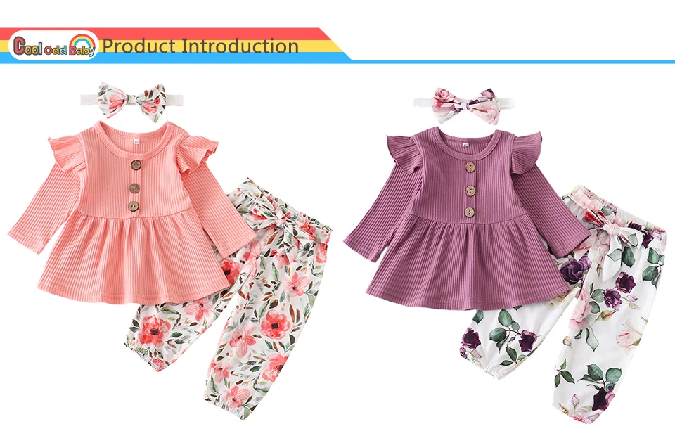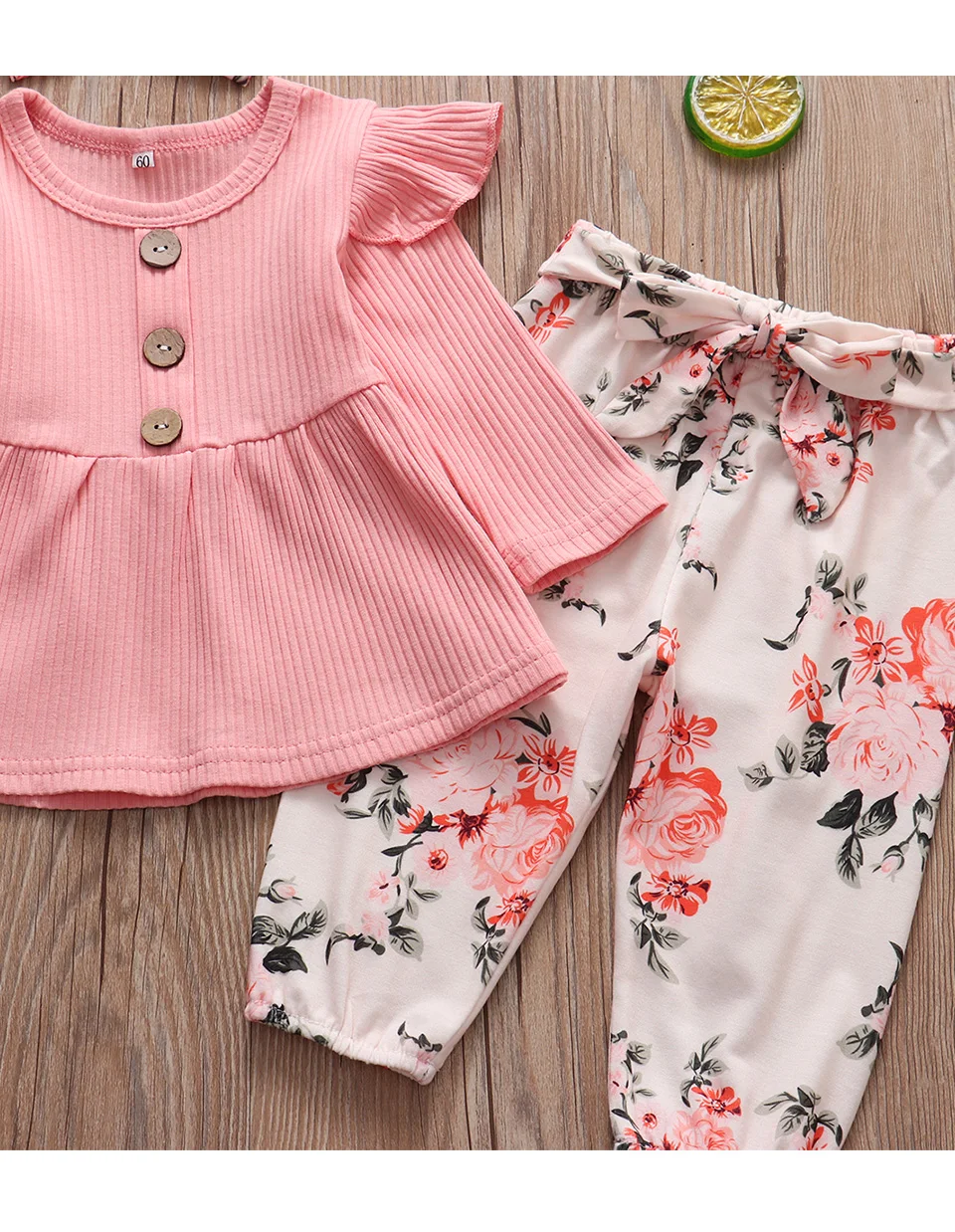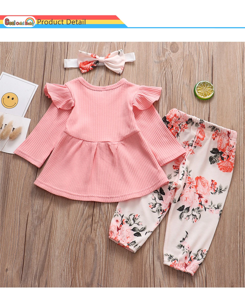 Spring Newborn Baby Girl Clothes Set Cute Pink Color Long Sleevs Tops Flower Pants Headband 0-24M 3Pcs Infant Girl Clothing Suit