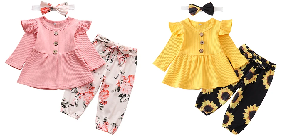 Spring Newborn Baby Girl Clothes Set Cute Pink Color Long Sleevs Tops Flower Pants Headband 0-24M 3Pcs Infant Girl Clothing Suit