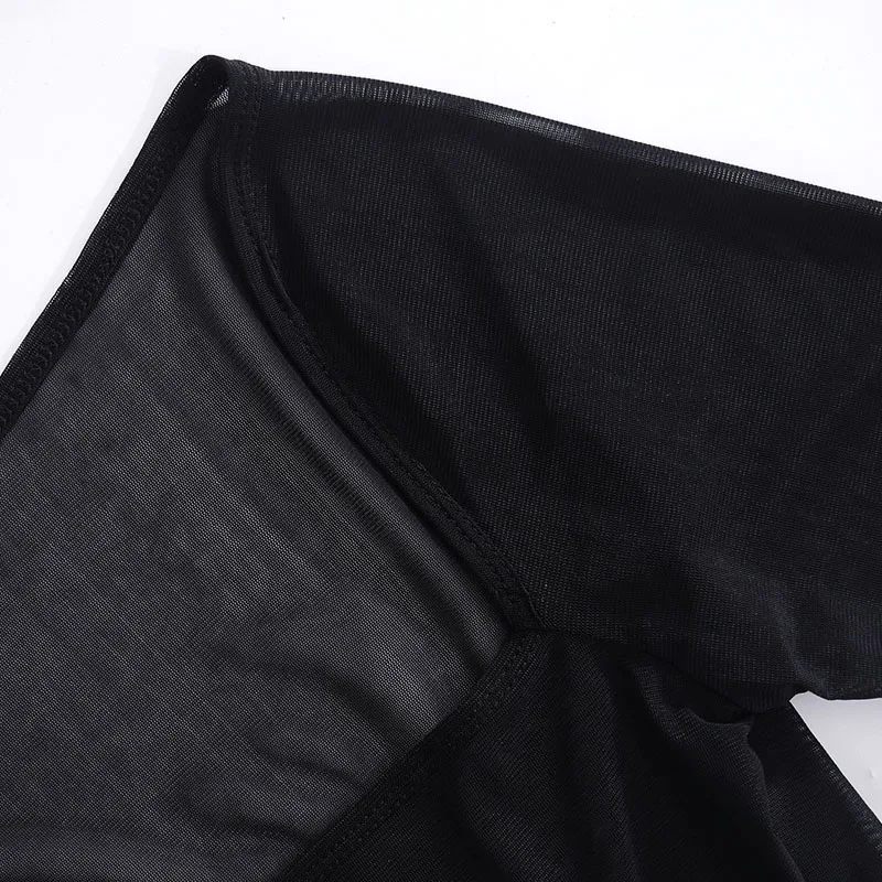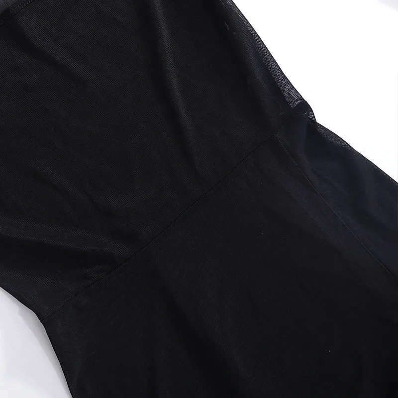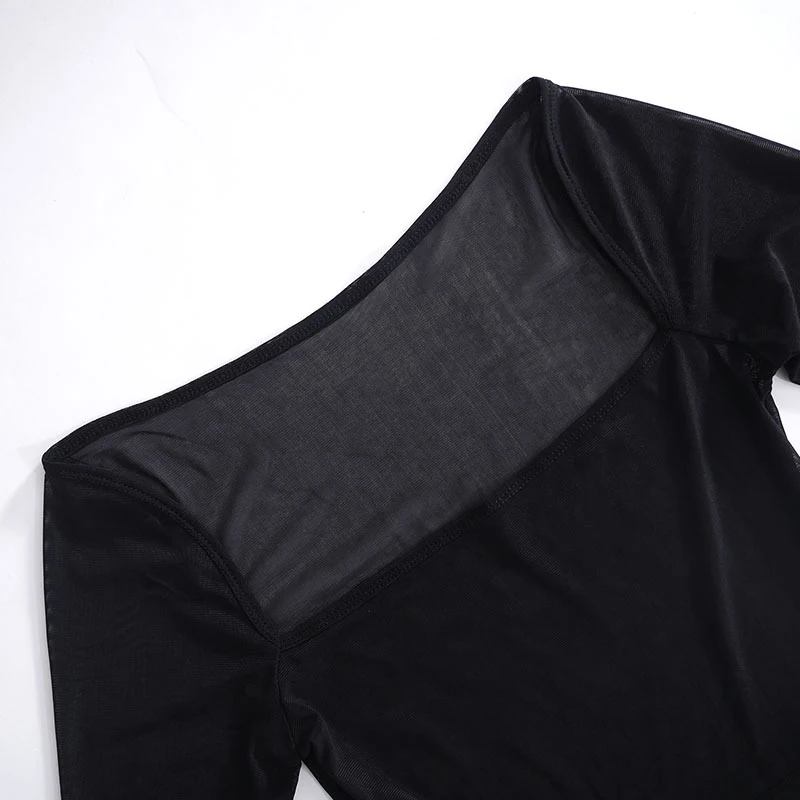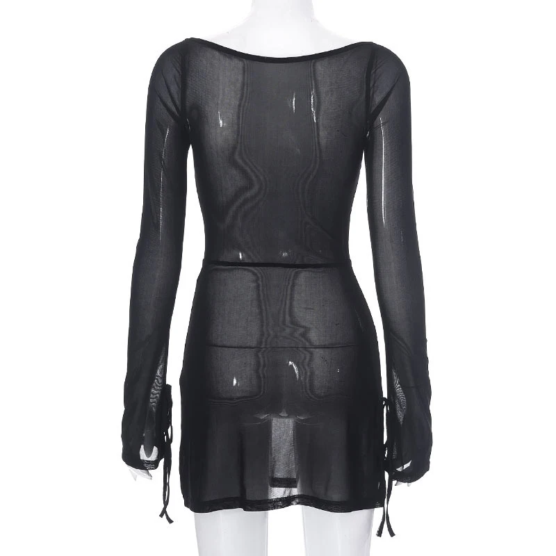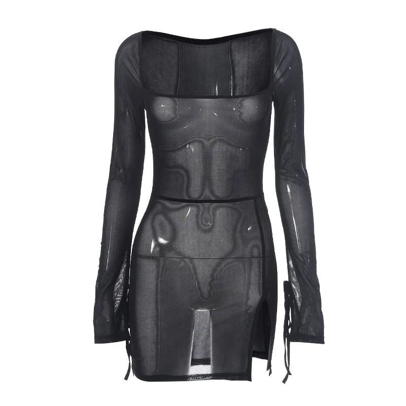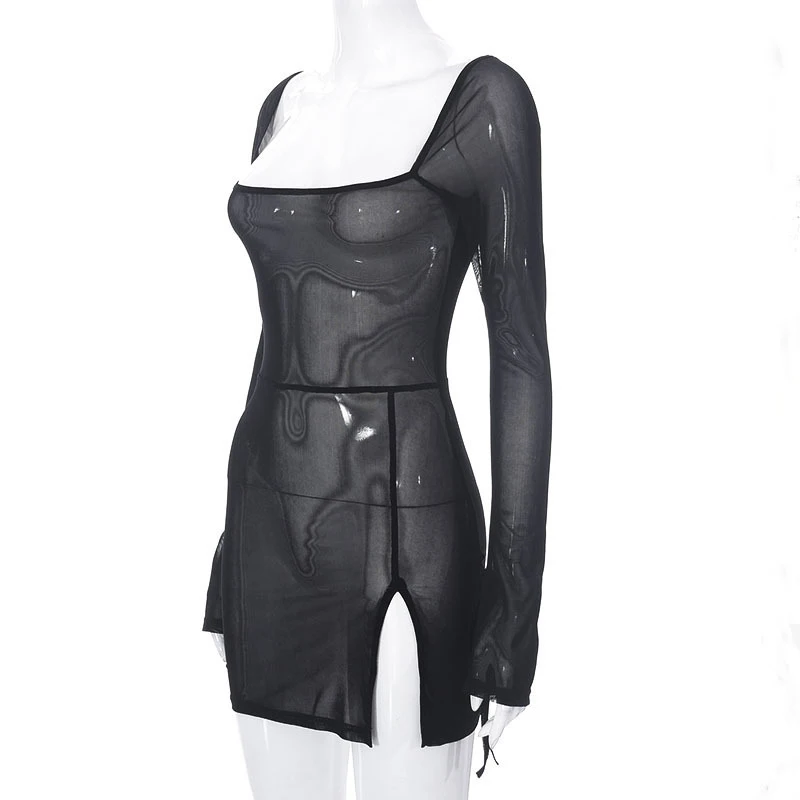 Square collar solid color mini dress with mesh fabric, sexy evening dress, club set, transparent vest, women’s long sleeves