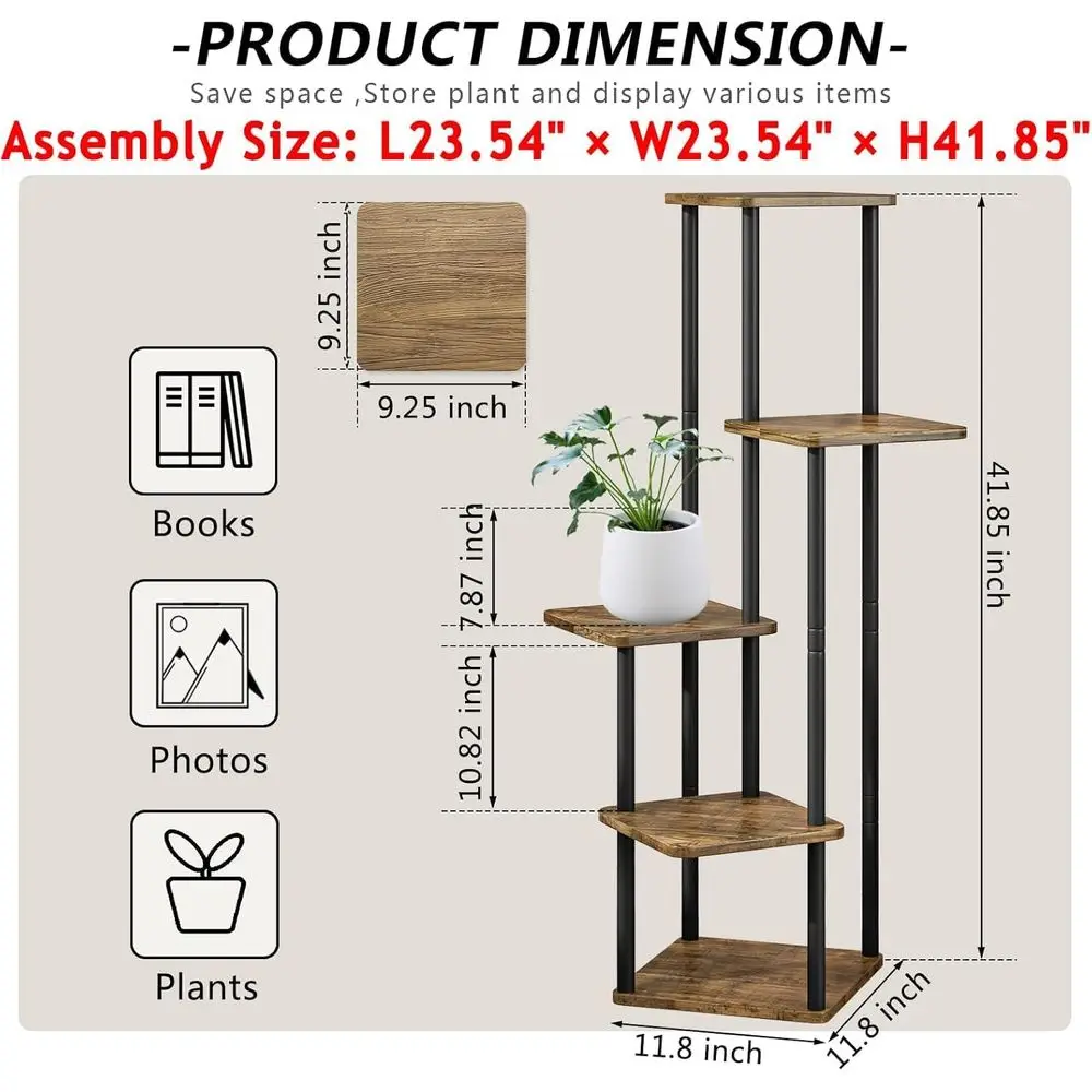 5 Tier Tall Plant ShelfThe Indoor Plant Stand includes 5 shelves, 23.54L x 23.54W x 41.85H inches,perfect for flower pots of various sizes and shapes, each plant can soak up sufficient sunlight to thrive. In addition to showcasing your lovely plant, you can also use it for your pictures or memorable knickknacks.