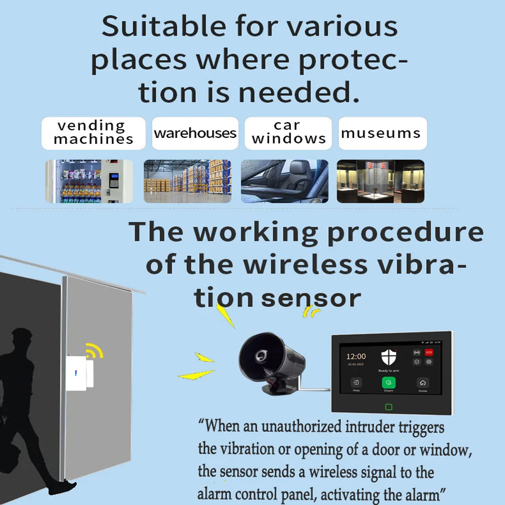 1.The sensor not only accurately monitors vibrations or glass breakage on doors and windows, but also monitors unauthorized opeing of doors and windows. Once triggered, the sensor sends a 433MHz wireless signal to the alarm host, which then activates the alarm. It must be useed with a 433MHz alarm host or Wi-Fi gateway and cannot operate independently.