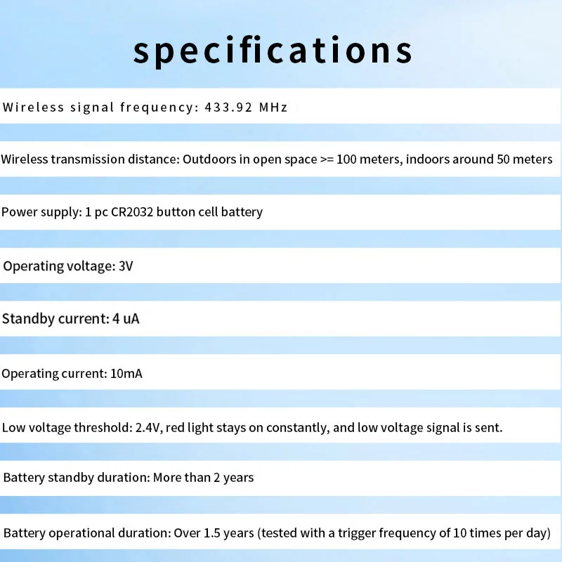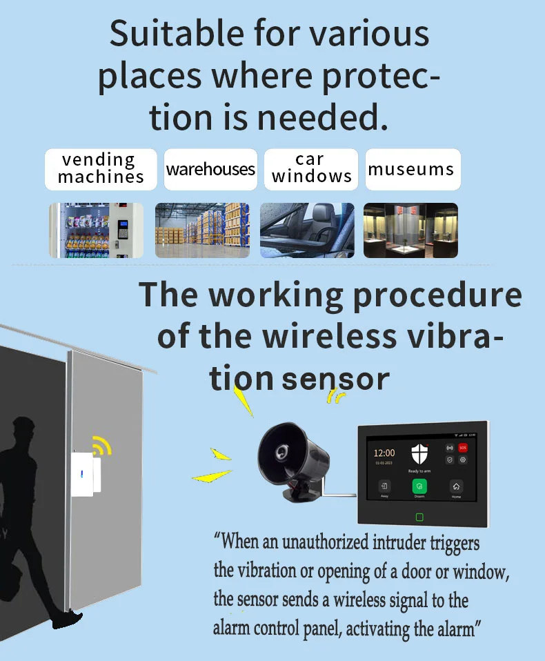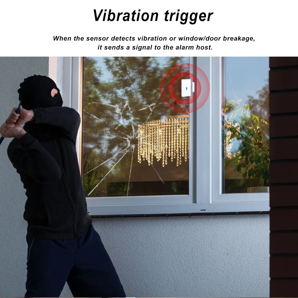 1.The sensor not only accurately monitors vibrations or glass breakage on doors and windows, but also monitors unauthorized opeing of doors and windows. Once triggered, the sensor sends a 433MHz wireless signal to the alarm host, which then activates the alarm. It must be useed with a 433MHz alarm host or Wi-Fi gateway and cannot operate independently.