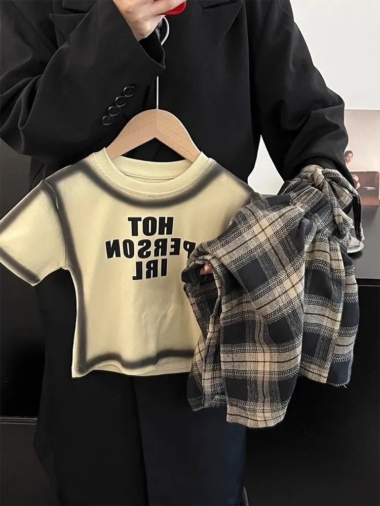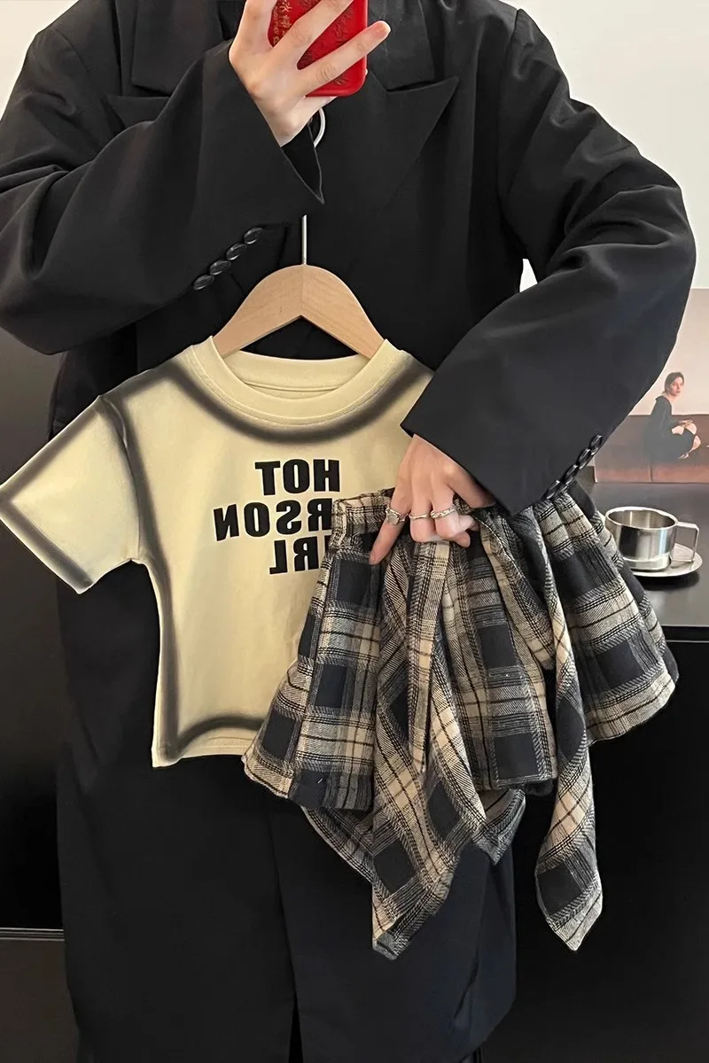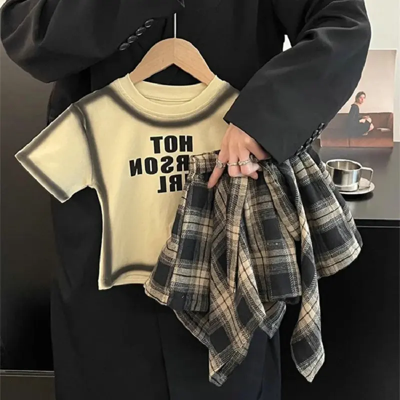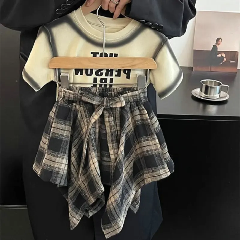 Summer Children’s Clothing Girl Set Fashionable Letter Stroke Edge Short Sleeved T-Shirt+Street Style Irregular Plaid Half Skirt