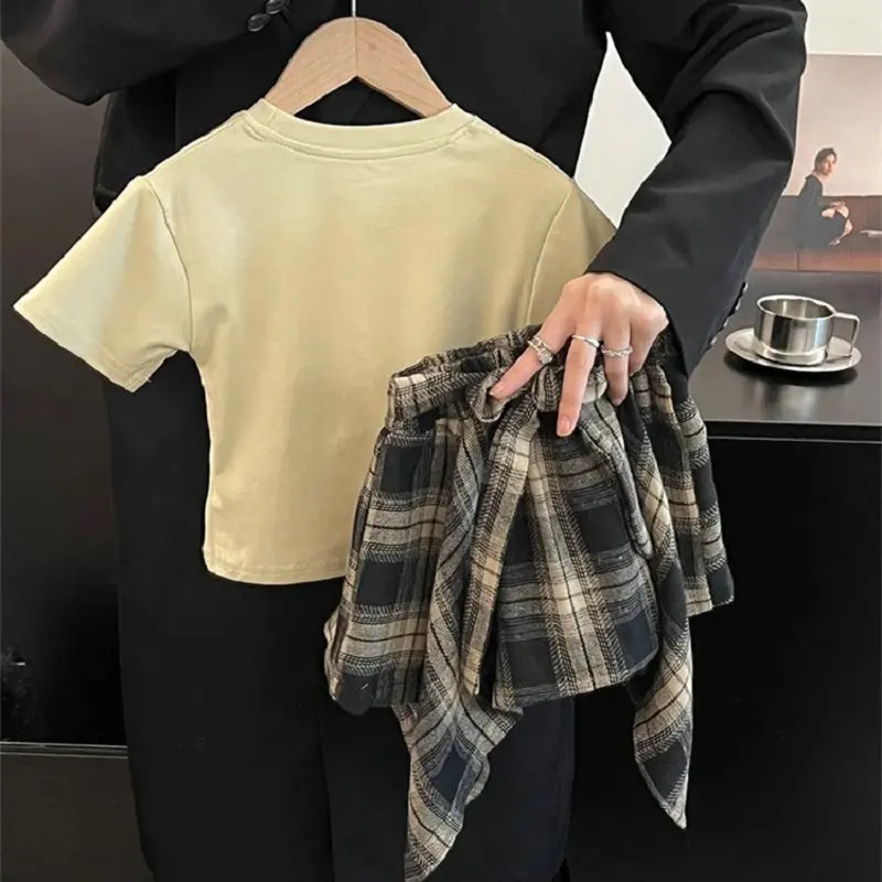 Summer Children’s Clothing Girl Set Fashionable Letter Stroke Edge Short Sleeved T-Shirt+Street Style Irregular Plaid Half Skirt