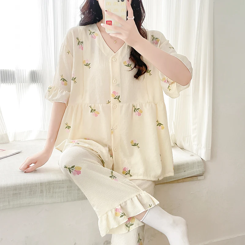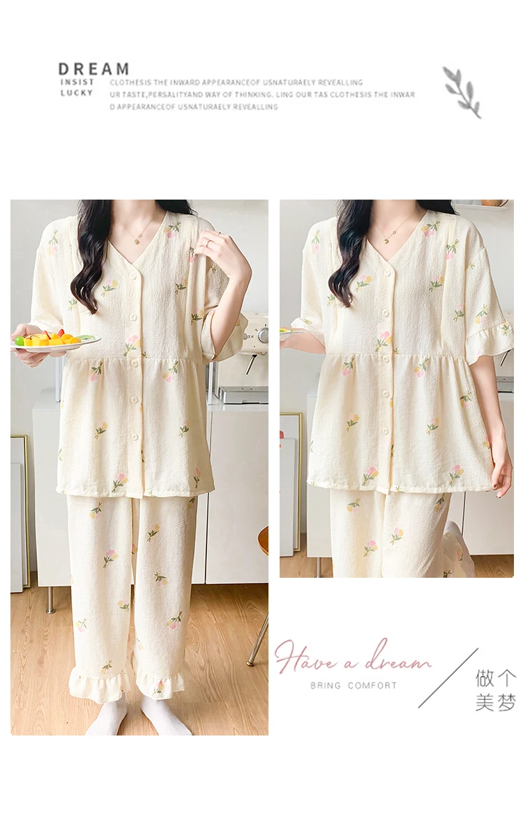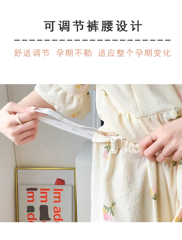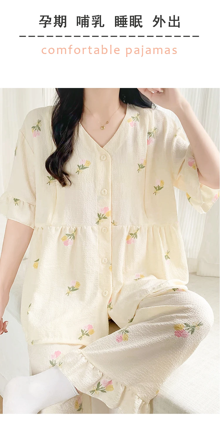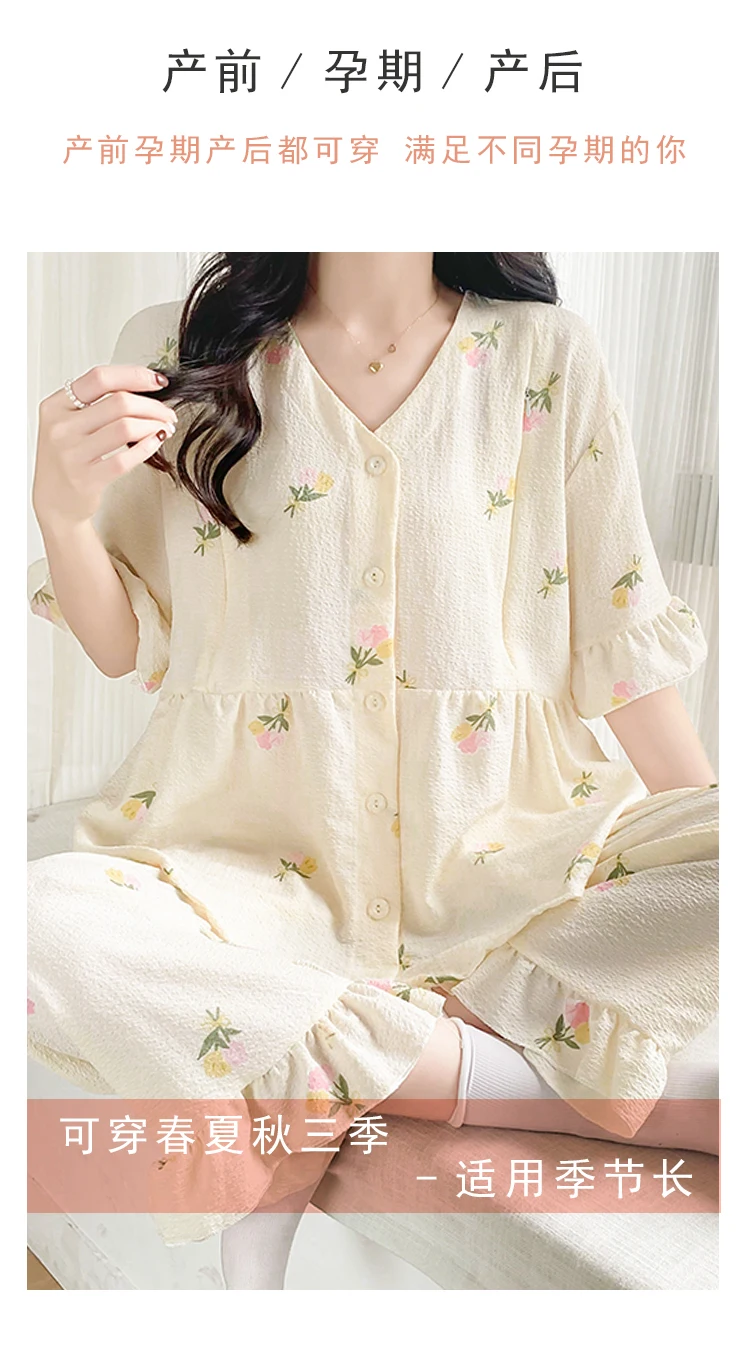 Summer Thin Maternity Nursing Sleepwear Set Loose Breastfeeding Tops Belly Pants Pajamas Pregnancy Short Sleeve Home Lounge Wear