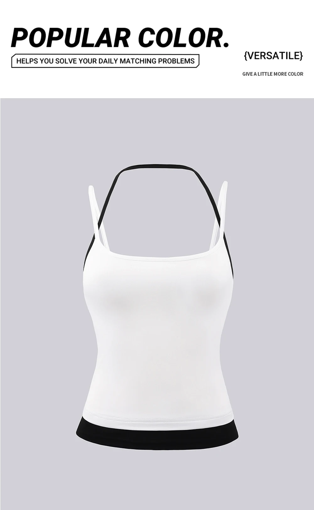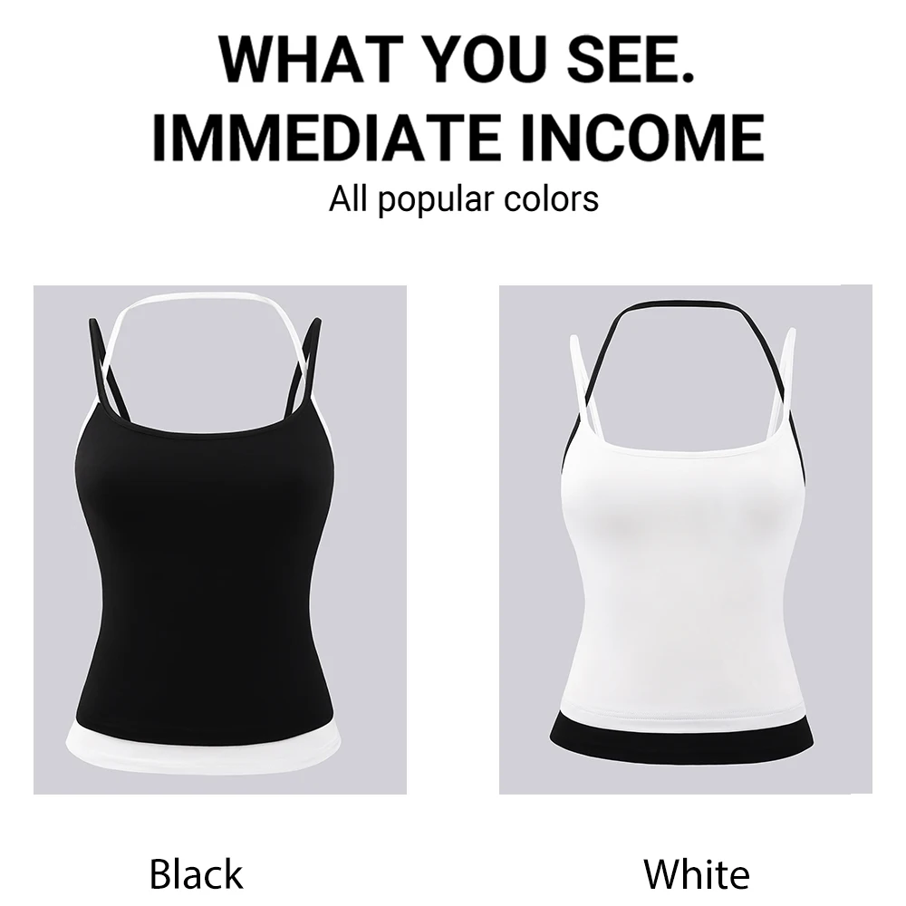 Summer Womens Solid Crop Vests Slim Tops Casual Soft Camisole Y2K Fake Two Piece Sleeveless Strap Tees Sporty Gym Outdoor Wear