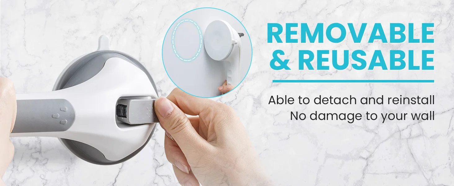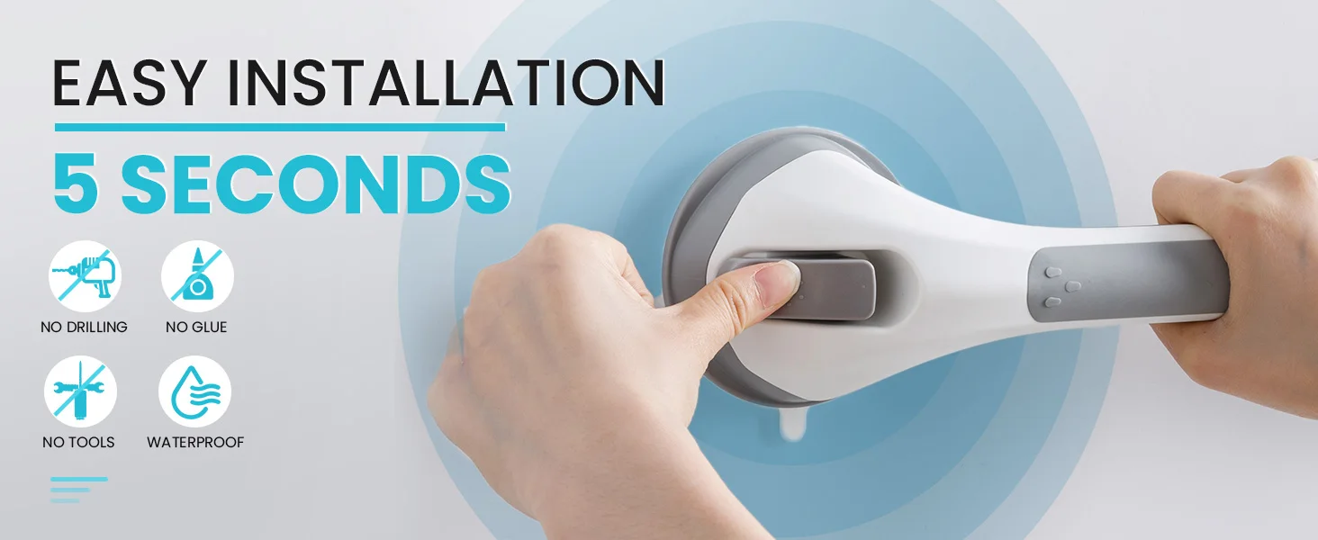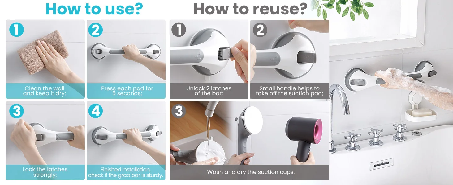 【Easy for Installation】Each suction cup shower handle equips 2 Strong suction cups with locking latches to provide stable protection. The bathtub hand rail ONLY needs to pull down the latches with 5 seconds and the installation is done, quickly and effortlessly! NO drilling, NO screws, NO glue and NO tools are required, fully removable, reusable and causing no damage to your wall.