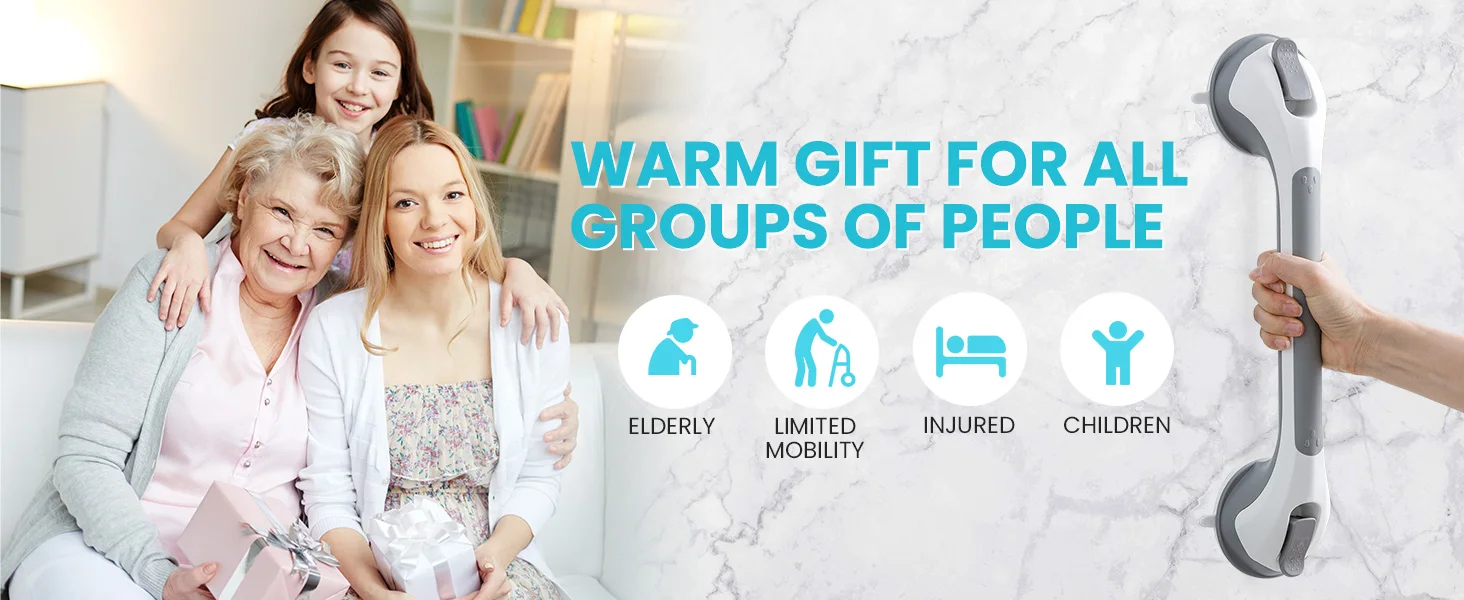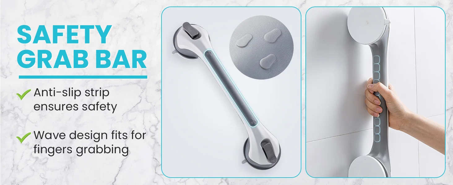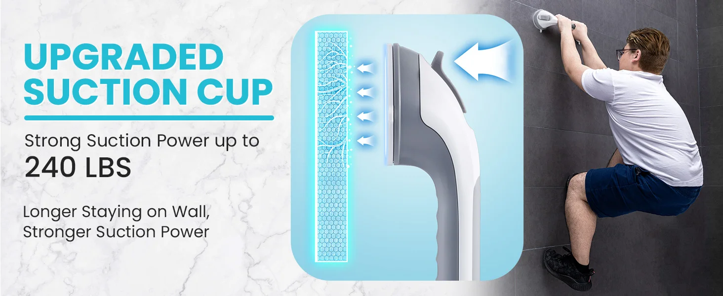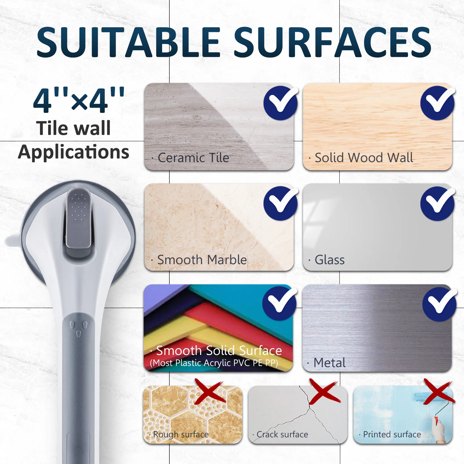 【Matters need Attention】For the safety of the seniors and elderly, please pay attention that the suction grab bars for shower ONLY sticks on smooth and non-porous AIRTIGHT walls which are NOT air-permeable like metal, glass, tile, marble, stainless steel and acrylic but does NOT apply on uneven tile, unfinished marble, wallpaper, dry wall, porous wall, etc. Please don't put all the body on the shower grip.