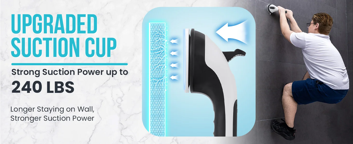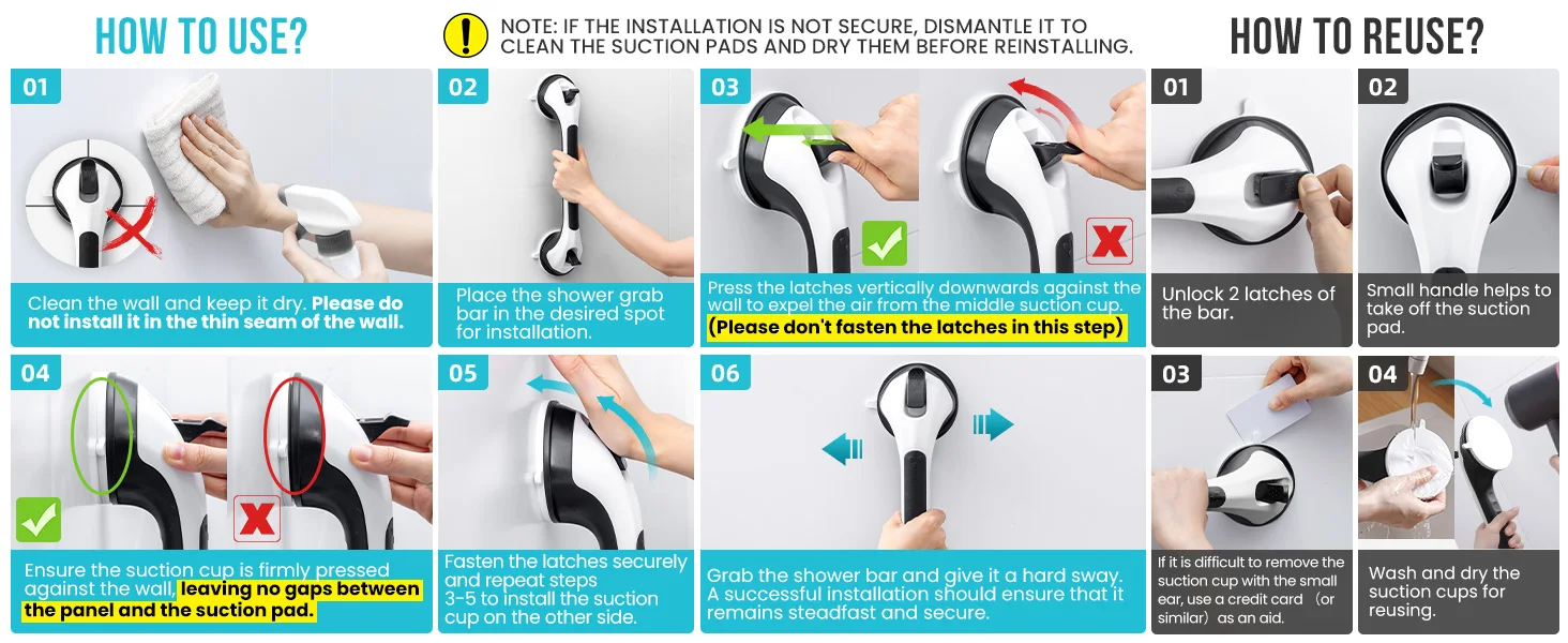 Easy for Installation: Each suction cup shower handle equips 2 Strong suction cups with locking latches to provide stable protection. The bathtub hand rail ONLY needs to pull down the latches with 5 seconds and the installation is done, quickly and effortlessly! NO drilling, NO screws, NO glue and NO tools are required, fully removable, reusable and causing no damage to your wall