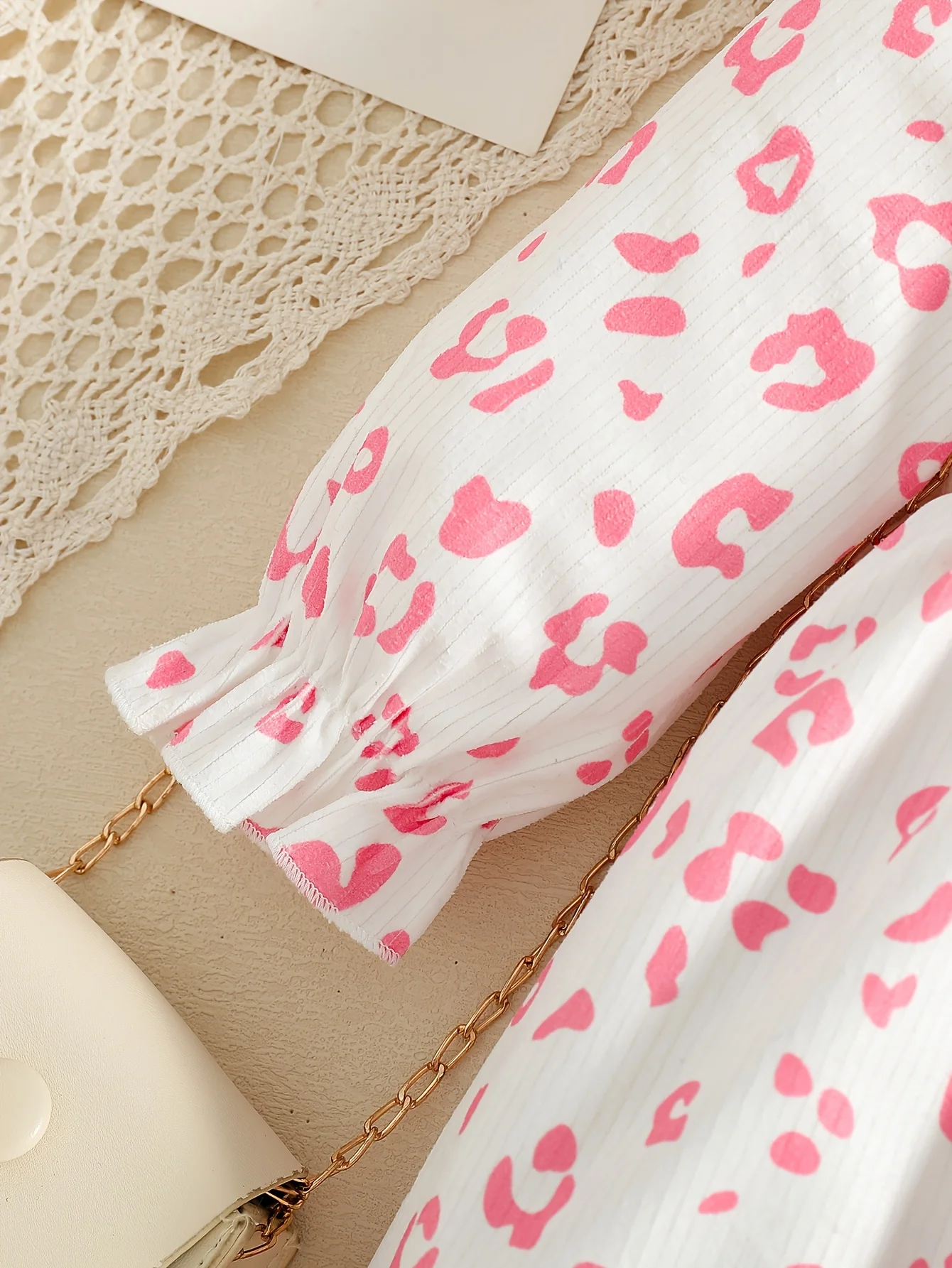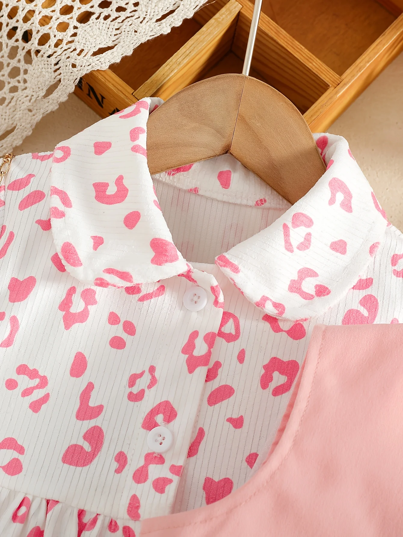 The dress features a lapel collar and long sleeves. The fabric has a slight texture, featuring a pink and white leopard print (which softens the wildness and makes it even more cute). The cuffs have ruffles to add a sweet element, and the skirt is a loose doll-style design that doesn't restrict the baby's movement.