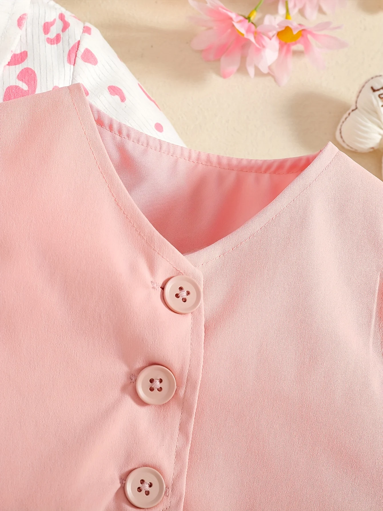 It pairs well with a matching pink waistcoat, featuring a V-neck and button decoration. It is simple and versatile, and can be layered for warmth.