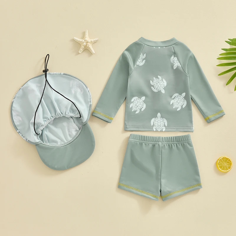 Boys Rash Guard Swim Set, Long Sleeve Turtle Print T-shirt with Shorts and Hat Swimwear