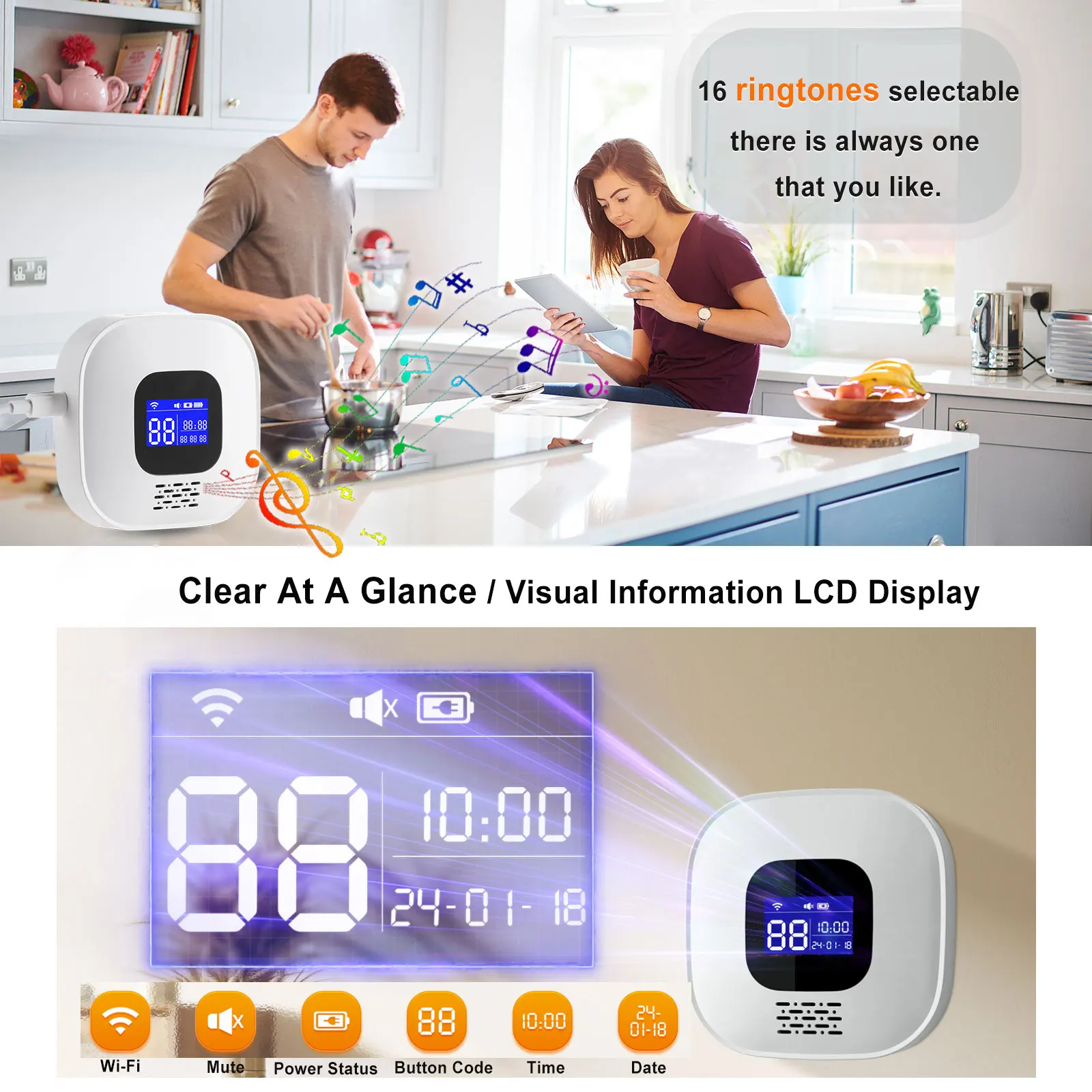 – With local alarm voice notification, 3 levels volume can be adjust (with mute mode), ringtone optional
