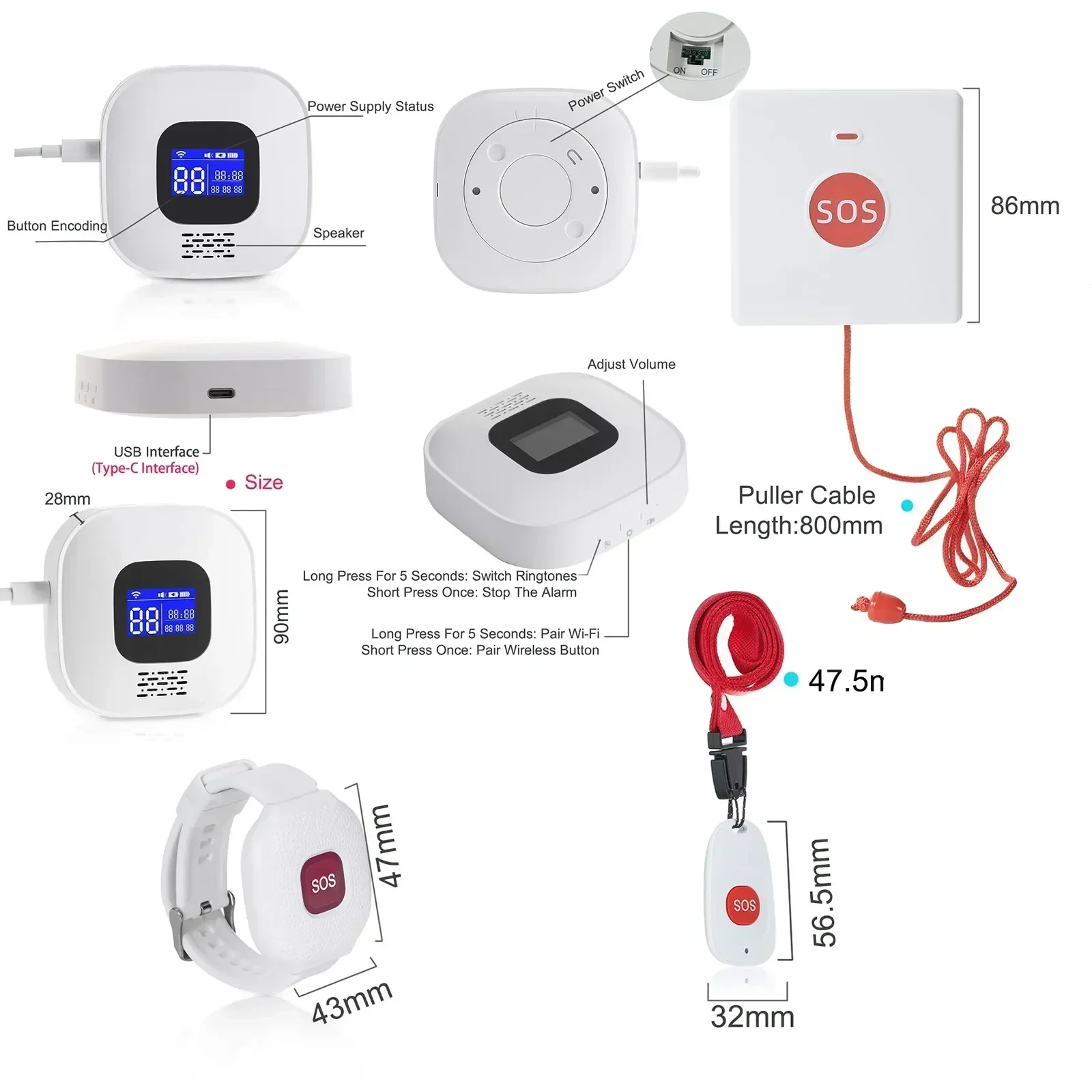 - Work distance: SOS Button to wifi host, 15 to 30m indoor
