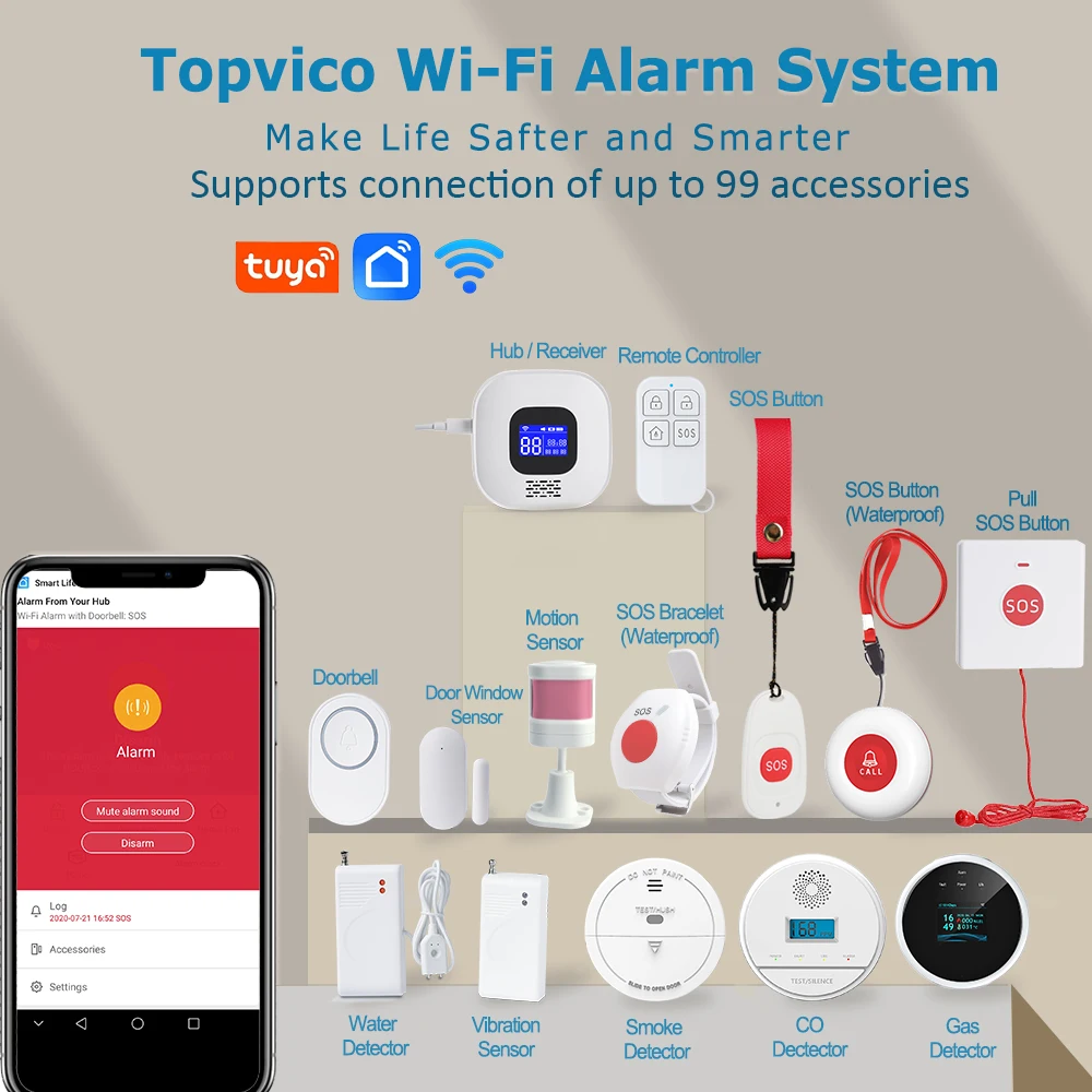 – Press SOS, SOS send signal to WIFI host, WIFI host send notification to APP, also with local alarm voice