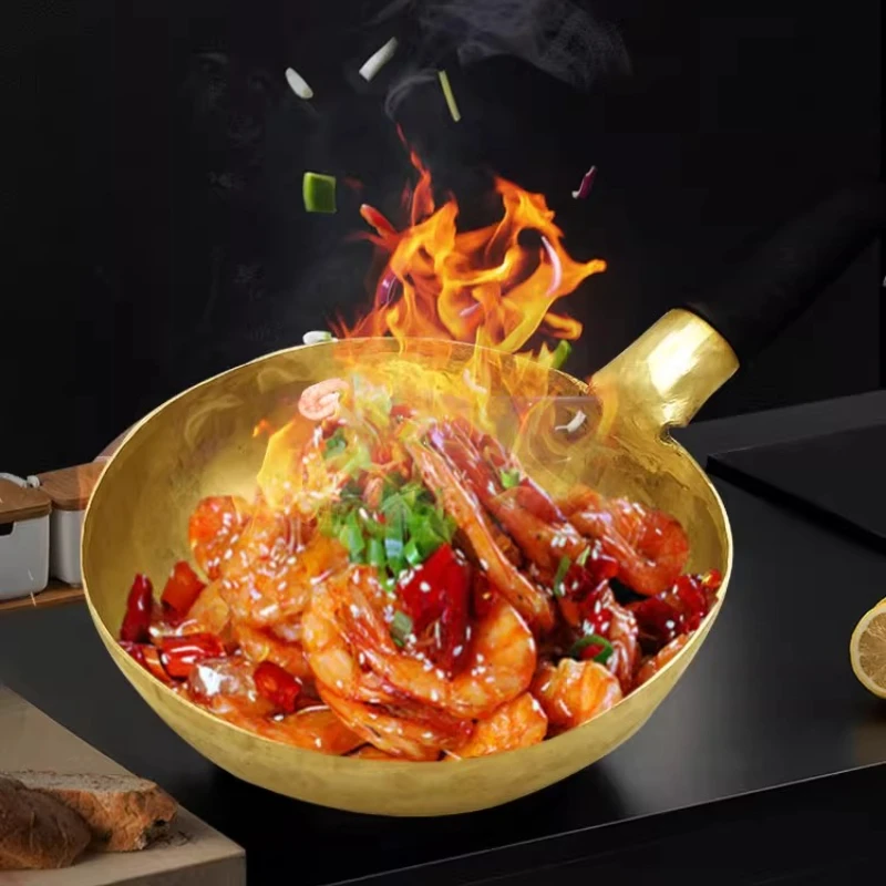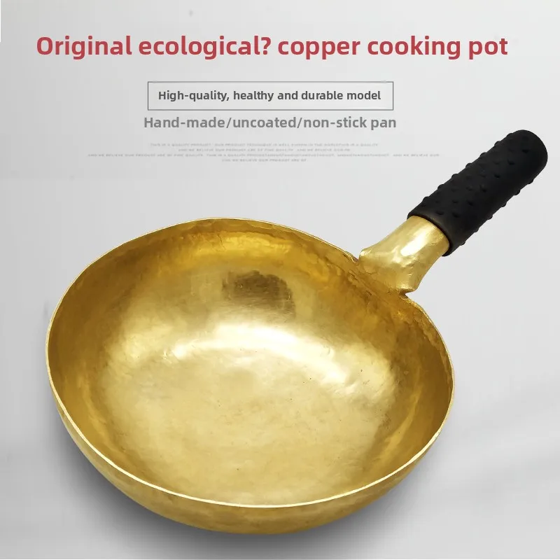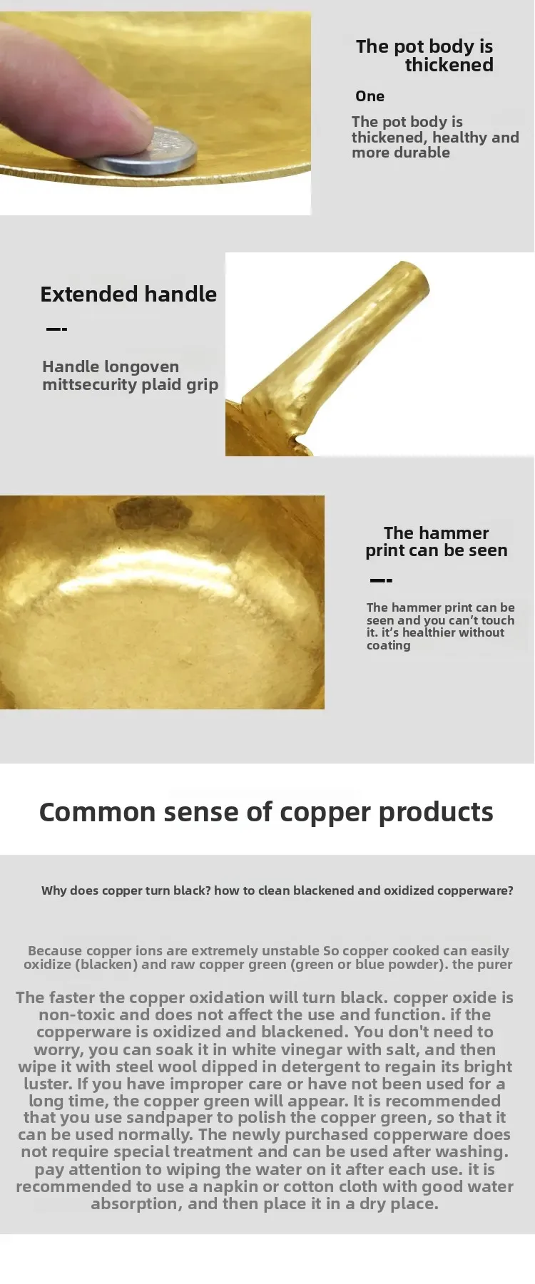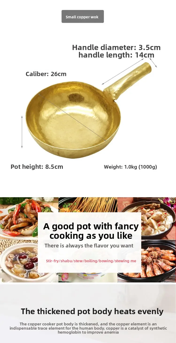 2. The thickened wok body ensures even heating. The copper wok body is thickened. Meanwhile, copper is an indispensable trace element for the human body. Copper is a catalyst for the synthesis of hemoglobin and can improve anemia