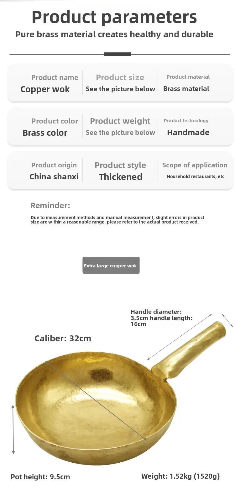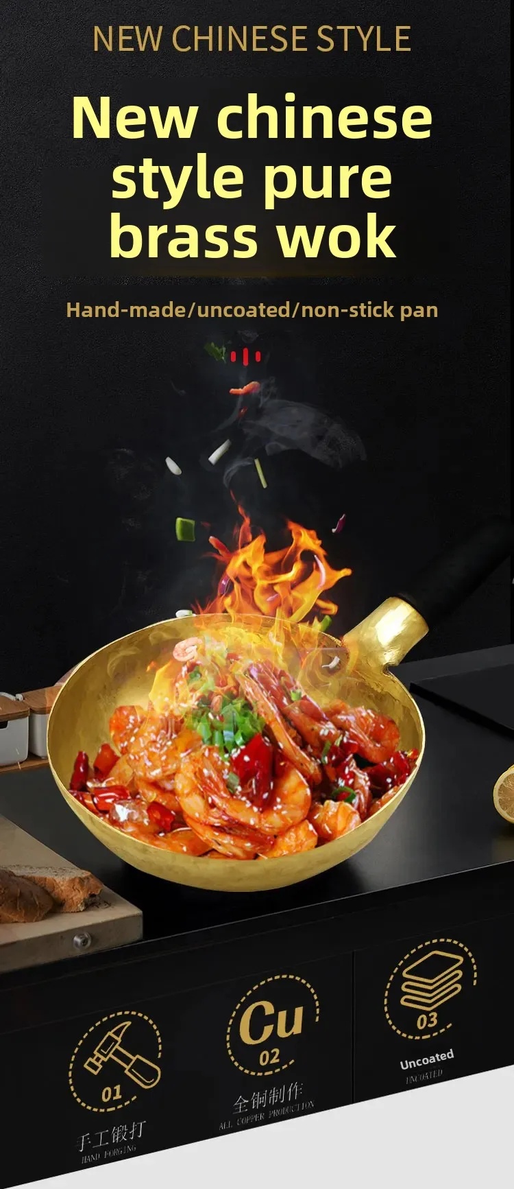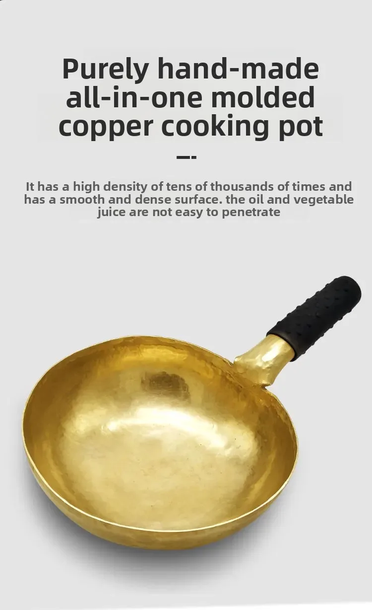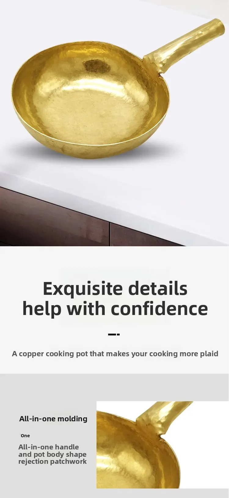 Traditional Handmade Copper Woks,Pure Brass Non-stick Pot Kitchen Cookware Uncoated Frying Pans Round Wok Cooker for Gas Stove
