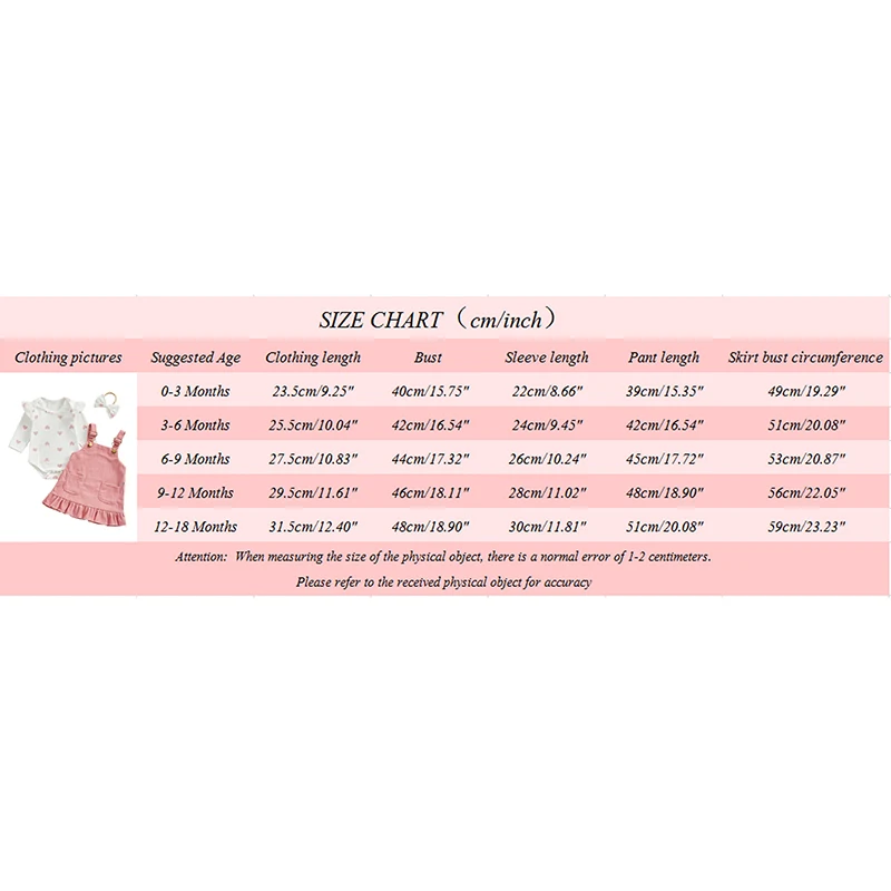 9-12M Romper Length: 11.61 Bust: 18.11 Sleeve: 11.02 Skirt Length: 18.90 Skirt Bust: 22.05 Advised Age: 9-12 Months