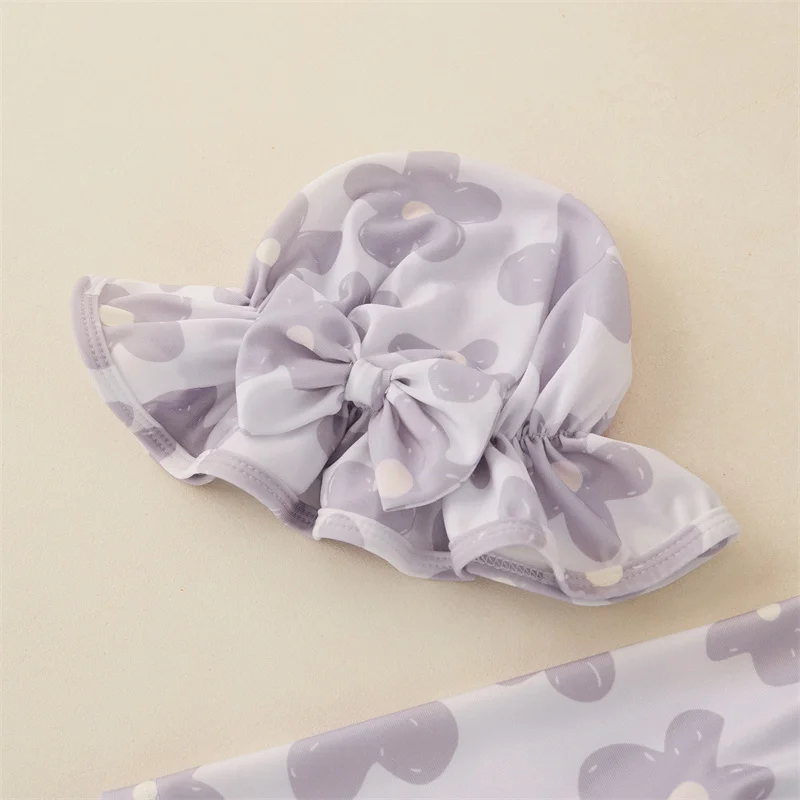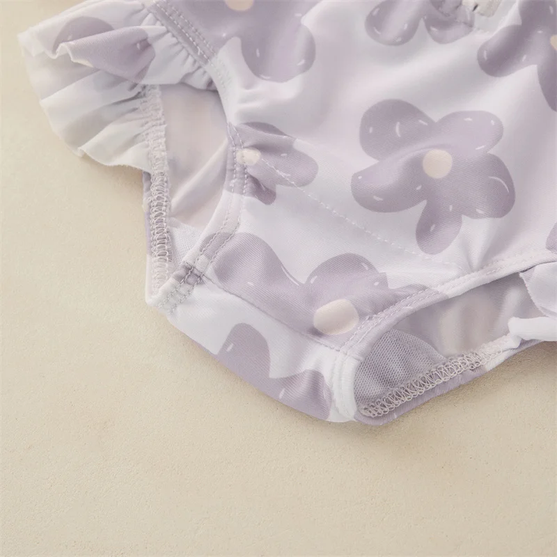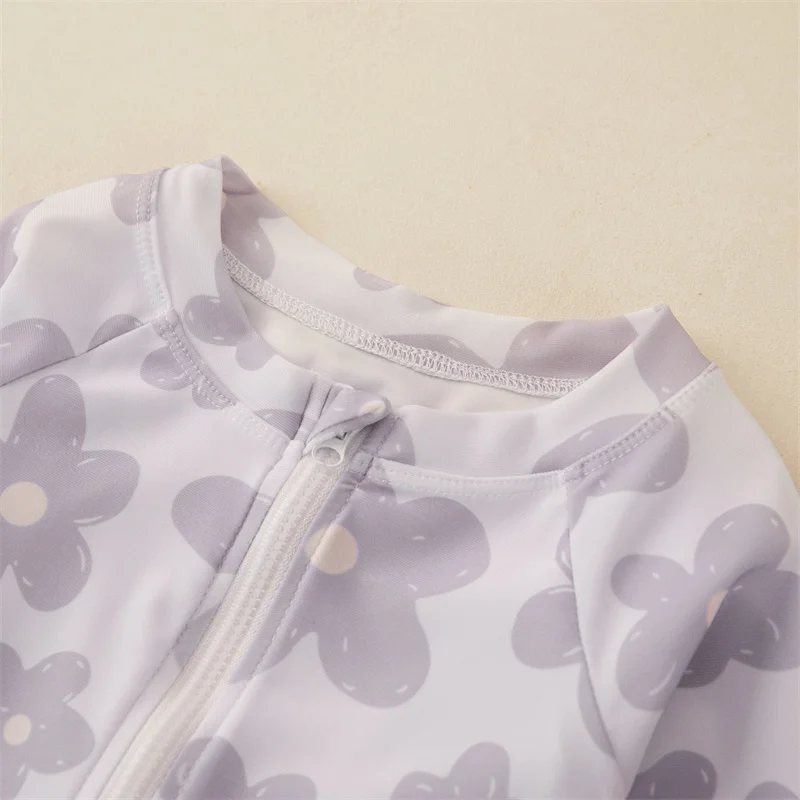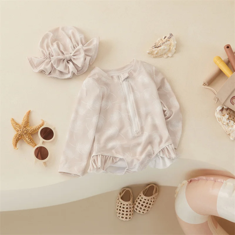 Tregren Toddler Infant Baby Girls Swimsuit Flower Print Zipper Long Sleeve Swimwear Bow Swim Cap Beach Bathing Suit Monokini