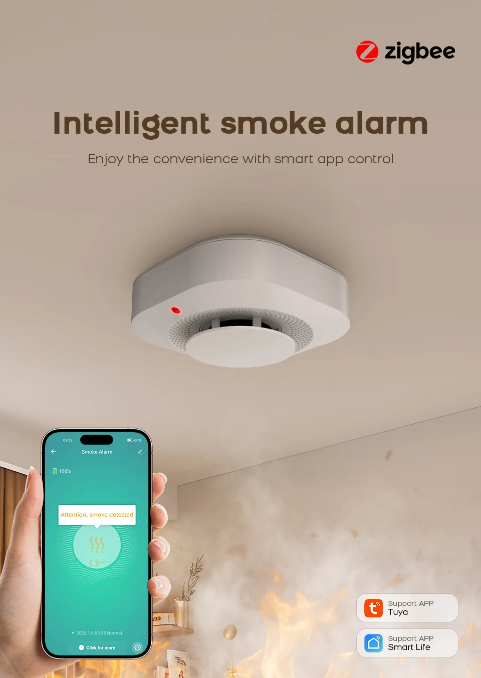1.Tuya Smart ZigBee/WiFi Smoke Detector is wonderful Safety & Security Guard for your home security.