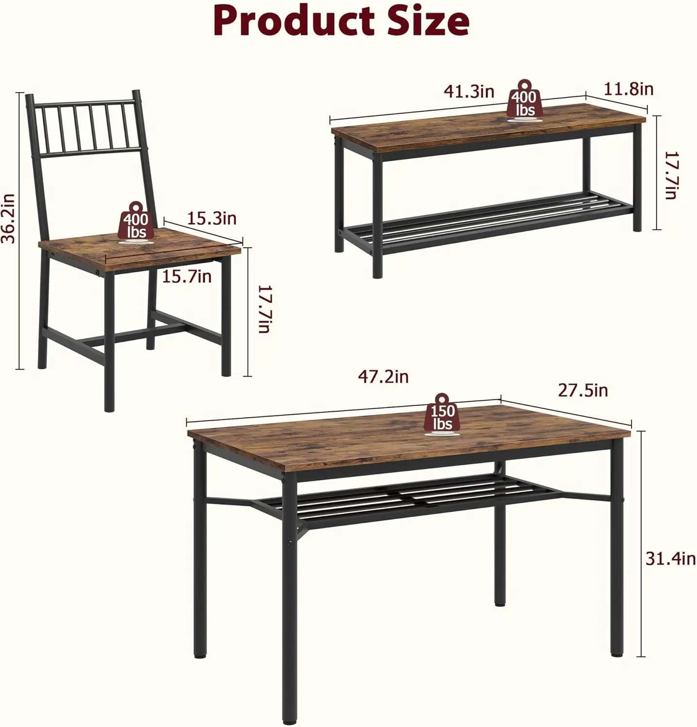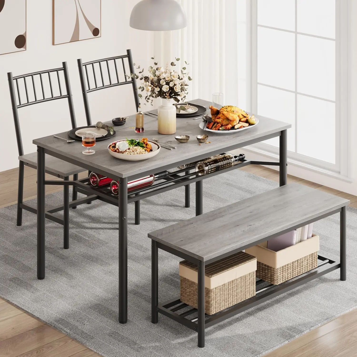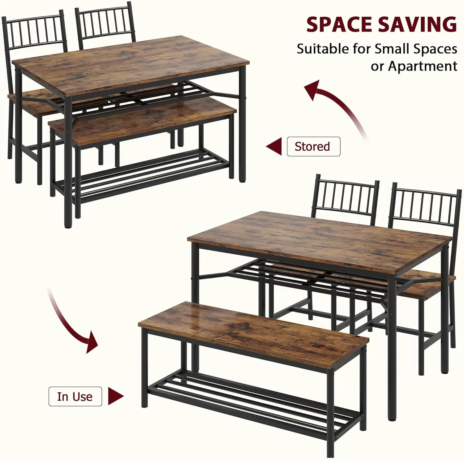 • 【Space-Saving for Small Areas】 2 benches tuck neatly under the 43.47”L table, saving 50% floor space. Perfect for apartments, studios, or small kitchens—keeps the area tidy.
