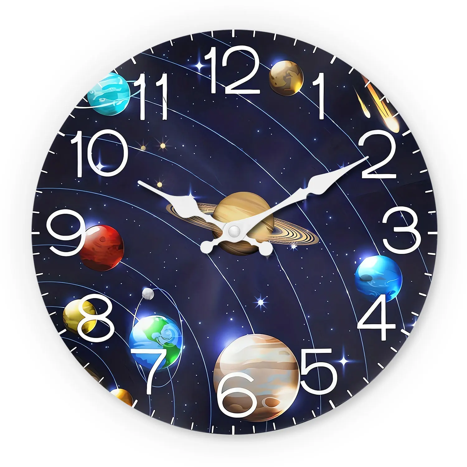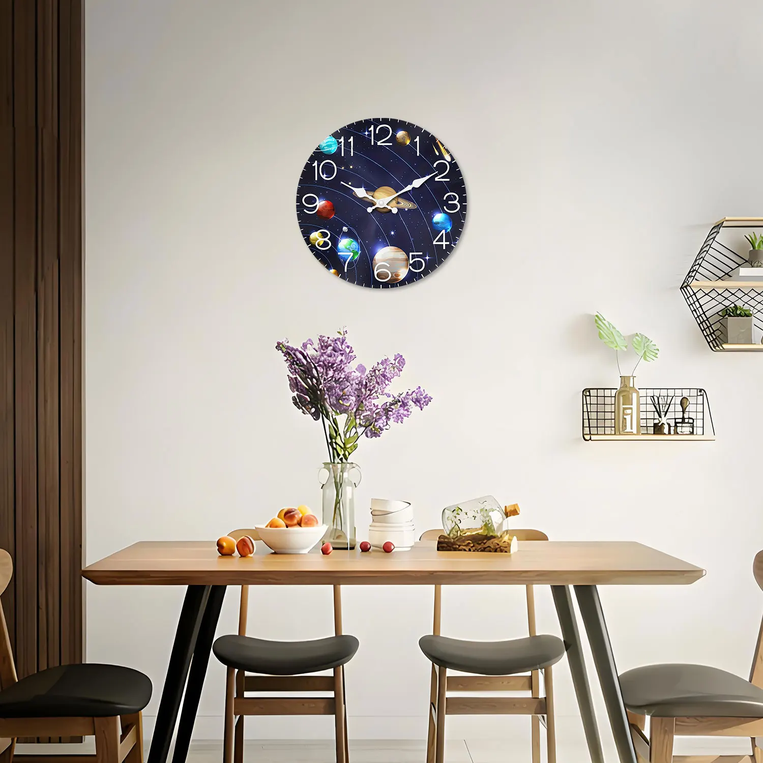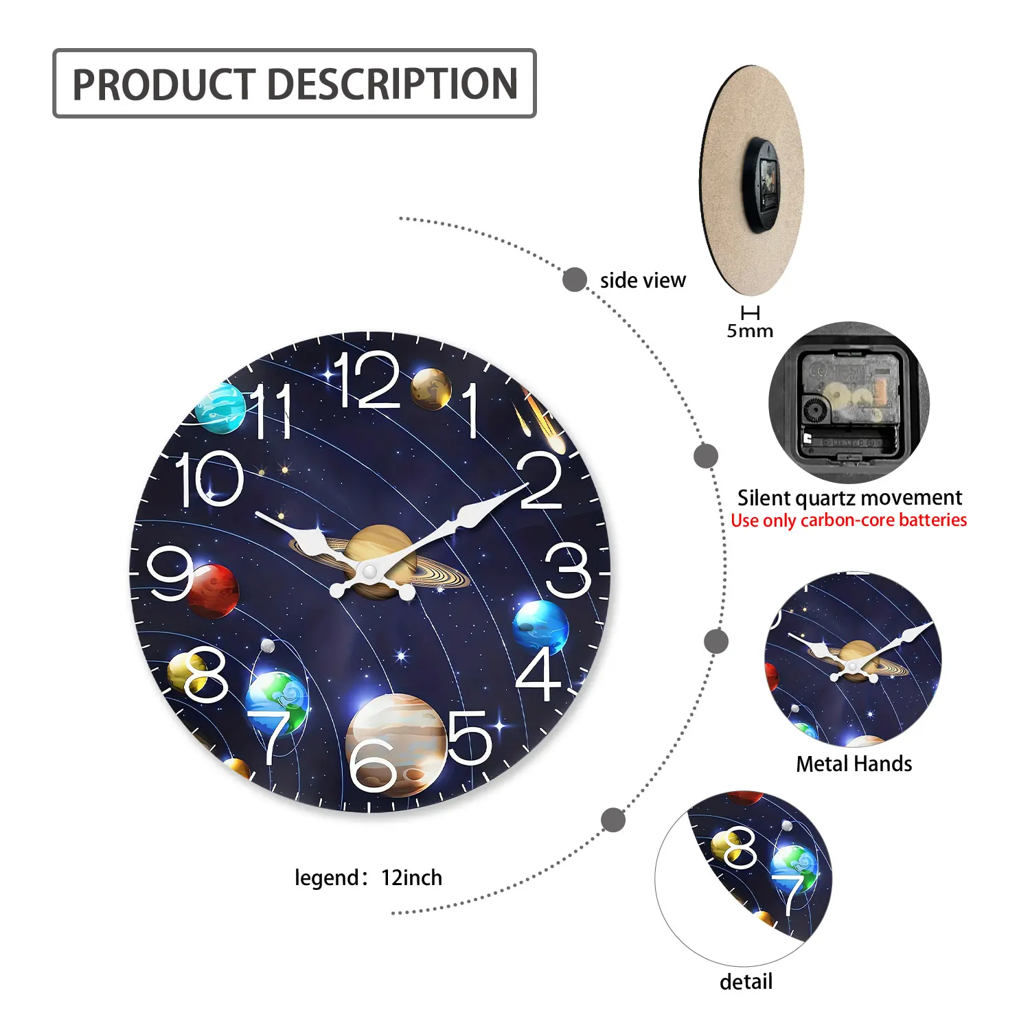 Universe Planet Pattern Wooden Wall Clock, 10-14inch Silent Wall Clocks, Aa Battery Powered, Suitable for Living Room, Bedroom, Office, Valentine’s Day, Carnival, Ramadan Festival, (No Batteries)