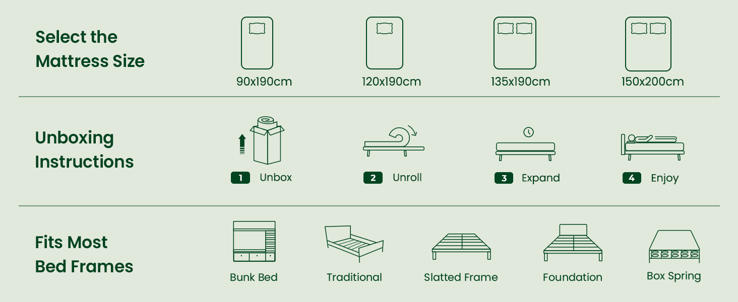 Mattress-in-a-box: your new mattress arrives conveniently compressed, vacuum-sealed, and neatly rolled in a box – easy to move. It fits most bed frames: bunk beds, twin beds, box springs, foundations and slatted patfroms. Bırakın 48-72 saat genişleyin, ve en iyi bir gece uykusuna dalacaksınız.