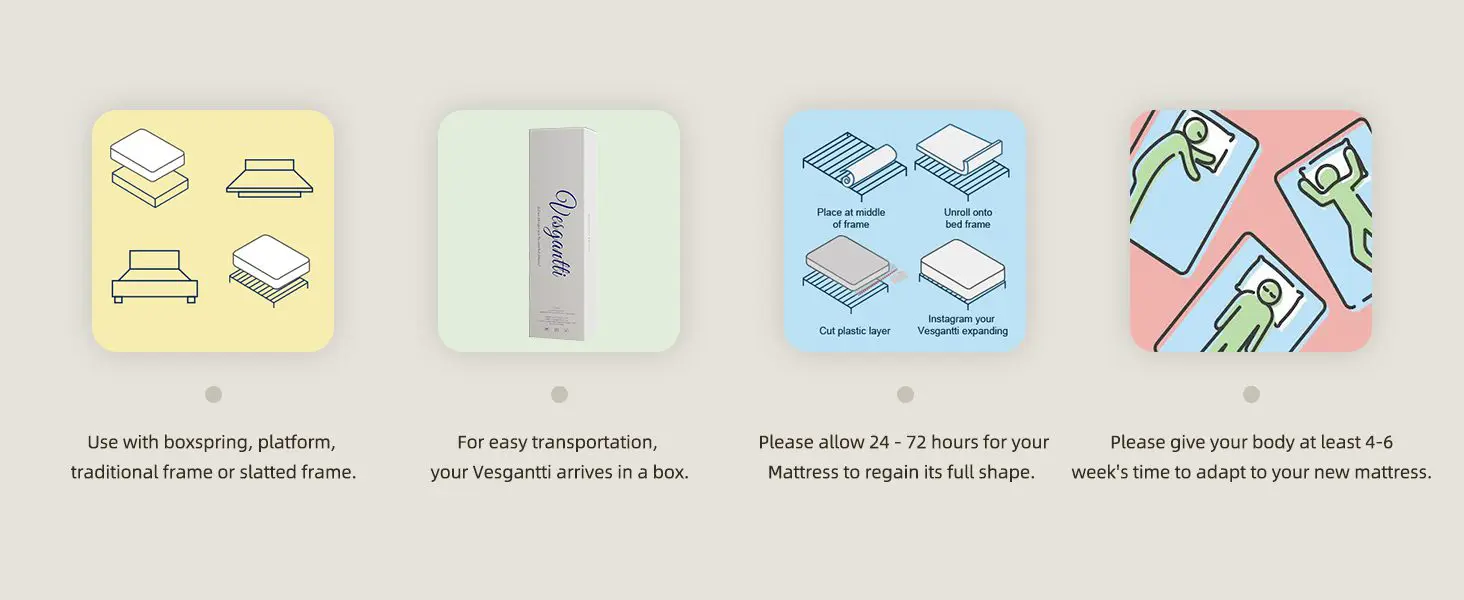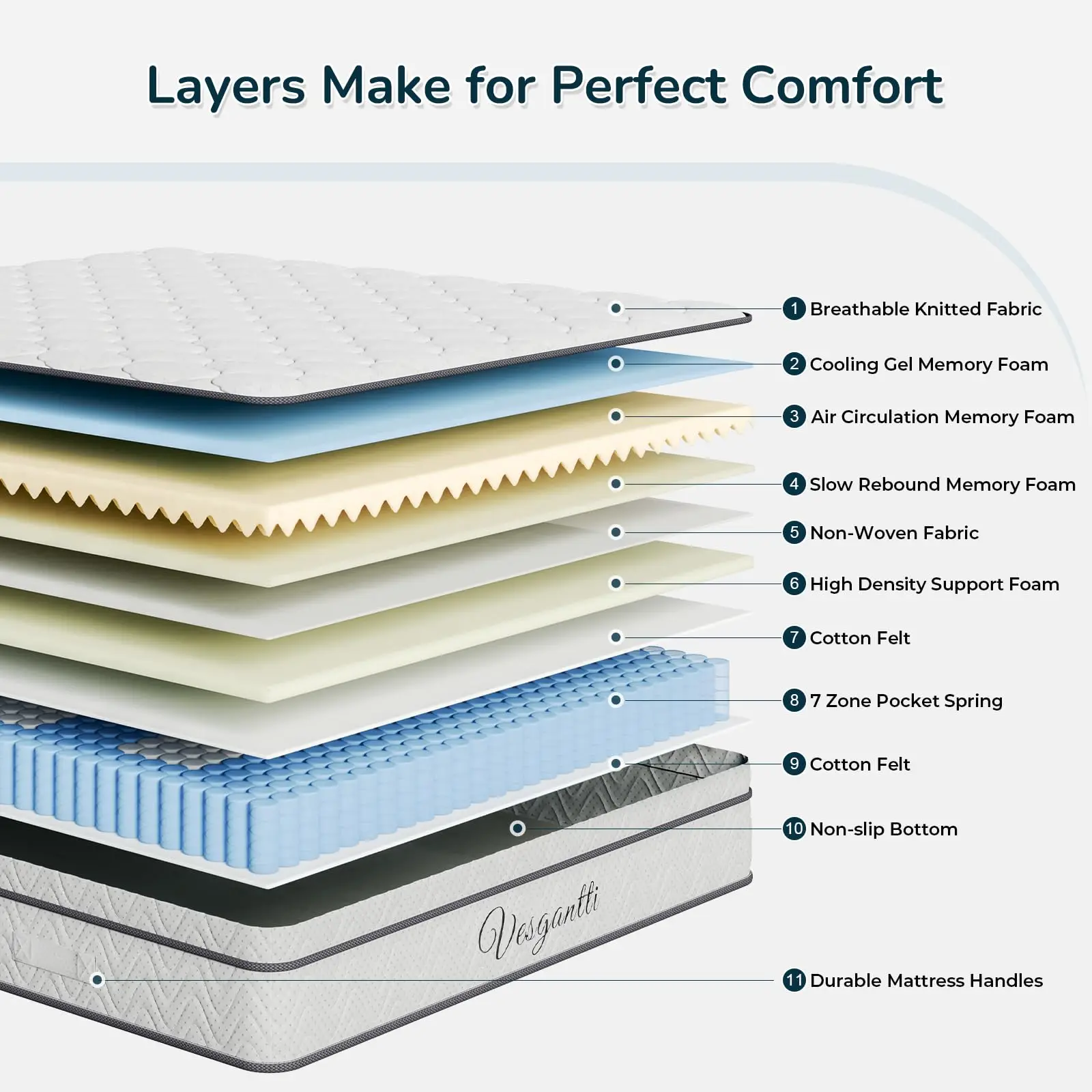 In an effort to improve your sleep cycle, vesgantti mattress aims to accommodate your sleep positions and adapt along the way.This premium thick hybrid mattress hugs your body so well.Let go of your tiredness with a good night’s sleep, wake up refreshed.